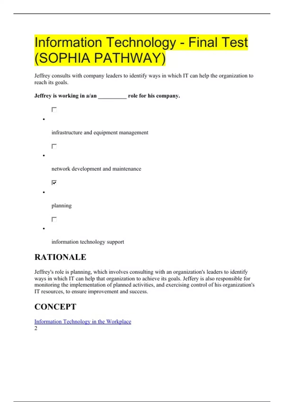Information Technology - Final Test (SOPHIA PATHWAY) Jeffrey consults with company leaders to identify ways in which IT can help the organization to reach its goals. Jeffrey is working in a/an __________ role for his company. • infrastructure and equipment management • network development and maintenance • planning • information technology support RATIONALE Jeffrey's role is planning, which involves consulting with an organization's leaders to identify ways in which IT can help that organization to achieve its goals. Jeffery is also responsible for monitoring the implementation of planned activities, and exercising control of his organization's IT resources, to ensure improvement and success. CONCEPT Information Technology in the Workplace 2 Alexis received an email message from an unknown sender that included an attachment. If she opens the attachment, what kind of malicious software might be activated, and what are the consequences? • Opening the attachment would release a worm, which would infect her system with a virus. • Opening the attachment would release a passive worm, which would infect her system with adware. • Opening the attachment would release a worm, which would infect her system with spyware. • Opening the attachment would release an active worm, which would infect her system with adware. RATIONALE Senders can transmit files to recipients by attaching them to email messages. Like "junk mail" delivered by the postal service, email users regularly receive unsolicited messages from unknown senders. These messages sometimes contain links to malicious websites or include attachments that contain malicious software (e.g., a worm). CONCEPT Network Security 3 Which of the following does NOT include both input and output components? • Video card • Touchscreen monitor • A portable SSD drive • A printer with a scanner RATIONALE The video card, also known as the graphics processing unit (GPU), generates images on a monitor and is an internal data processing component. A printer with a scanner, a touchscreen monitor, and a portable SSD drive are examples of input AND output devices because they enable users to receive information from a computing system, and send information into a computing system. CONCEPT Computer Components and Roles 4 Which of the following is NOT an example of computer software? • OS X • Firefox • Windows Media Player • ROM RATIONALE Read-only memory (ROM) is a type of nonvolatile memory used in computers and other electronic devices. ROM is not software. CONCEPT Computer Software 5 Select the true statement about the motherboard. • It provides much of the electrical connection between different computer parts. • It executes the commands sent to it by the application software. • It acts as the working memory of the computer by transferring data from the hard disk for processing. • It acts as a storage point for read-only memory (ROM). RATIONALE A motherboard is a printed circuit board that contains the principal components of a computer or other device. It includes connectors into which other circuit boards can be slotted. A motherboard provides much of the bus of the computer, and is the main circuit board where the memory, storage, and CPU connect. CONCEPT Internal Computer Hardware 6 Kirby visited a sweepstakes website and agreed to download a new program. Later, when he tried to use a word processing program, his document files became corrupted. How can Kirby try to remove the offending program and prevent future attacks? •