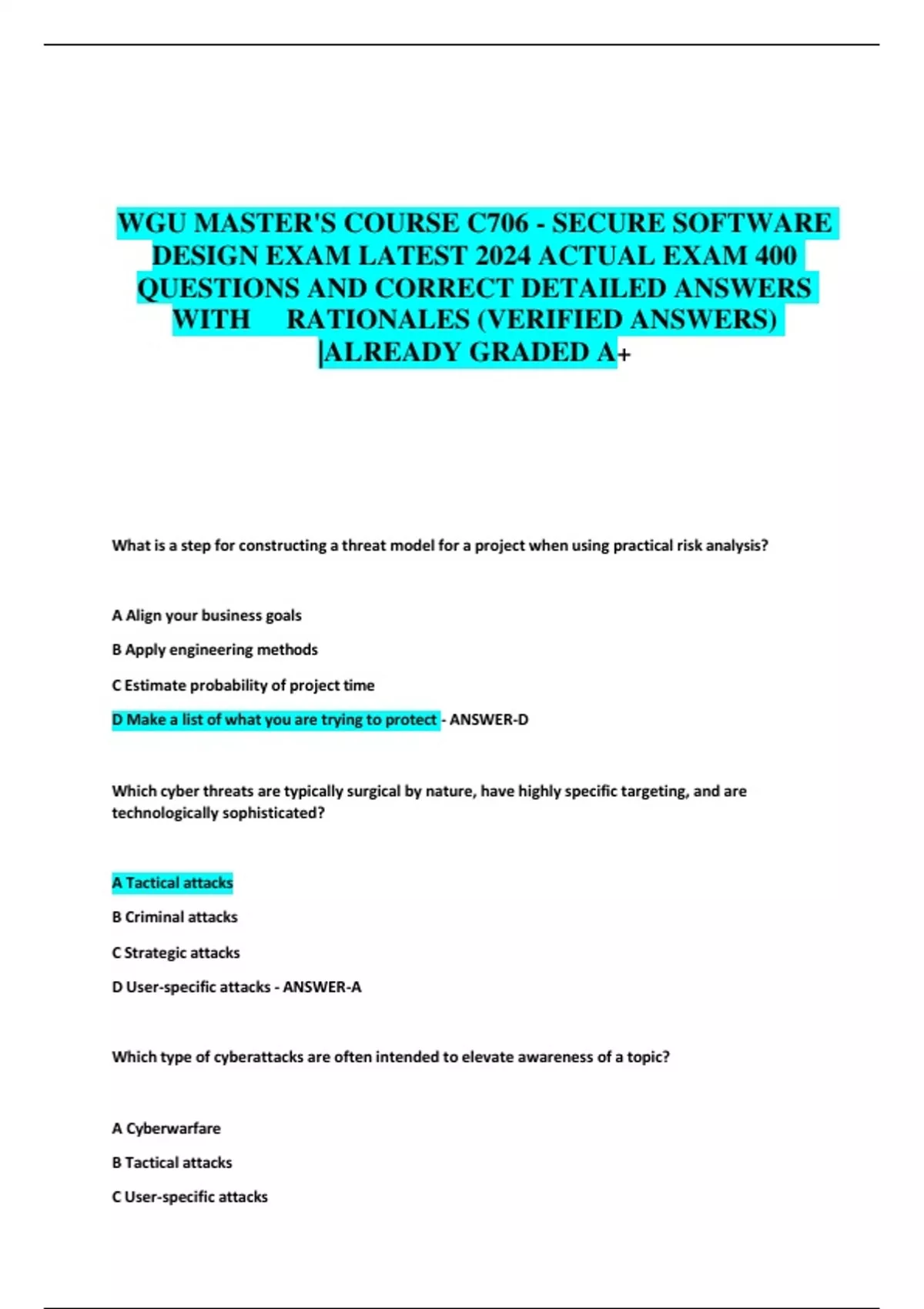 WGU MASTER'S COURSE C706 - SECURE SOFTWARE DESIGN EXAM LATEST 2024 ACTUAL EXAM 400 QUESTIONS AND CORRECT DETAILED ANSWERS WITH RATIONALES (VERIFIED ANSWERS) |ALREADY GRADED A+
