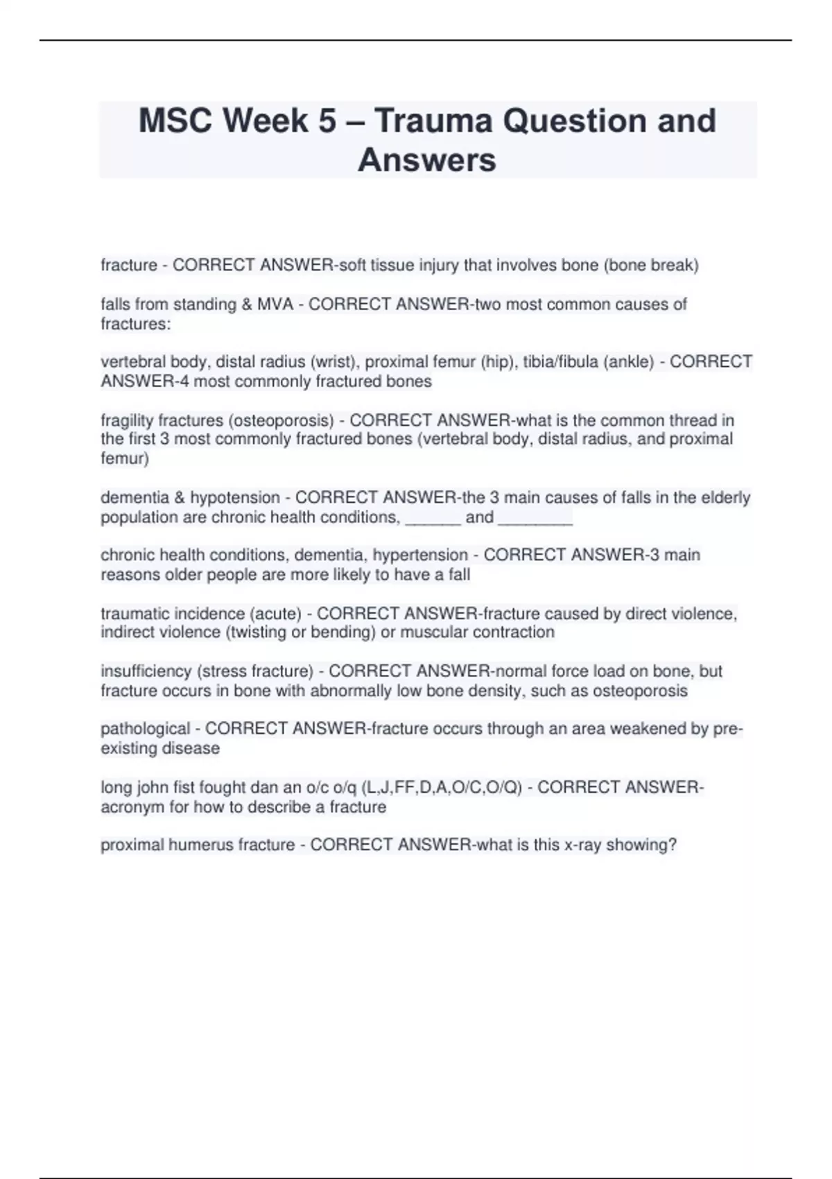 MSC Week 5 – Trauma Question and Answers fracture - CORRECT ANSWER-soft tissue injury that involves bone (bone break) falls from standing & MVA - CORRECT ANSWER-two most common causes of fractures: vertebral body, distal radius (wrist), proximal femur (hip), tibia/fibula (ankle) - CORRECT ANSWER-4 most commonly fractured bones fragility fractures (osteoporosis) - CORRECT ANSWER-what is the common thread in the first 3 most commonly fractured bones (vertebral body, distal radius, and proximal femur) dementia & hypotension - CORRE