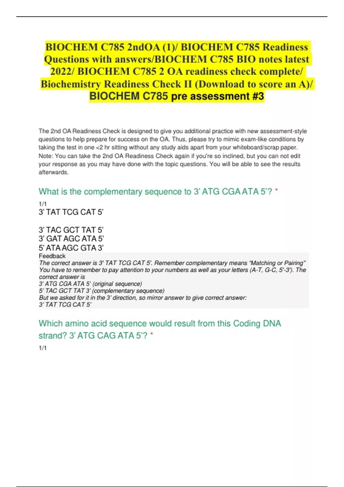BIOCHEM C785 2ndOA (1)/ BIOCHEM C785 Readiness Questions with answers/BIOCHEM C785 BIO notes latest 2022/ BIOCHEM C785 2 OA readiness check complete/ Biochemistry Readiness Check II (Download to score an A)/ BIOCHEM C785 pre assessment #3 The 2nd OA Readiness Check is designed to give you additional practice with new assessment-style questions to help prepare for success on the OA. Thus, please try to mimic exam-like conditions by taking the test in one <2 hr sitting without any study aids apart from your whiteboard/scrap paper. Note: You can take the 2nd OA Readiness Check again if you're so inclined, but you can not edit your response as you may have done with the topic questions. You will be able to see the results afterwards. What is the complementary sequence to 3’ ATG CGA ATA 5’? * 1/1 3’ TAT TCG CAT 5’ 3’ TAC GCT TAT 5’ 3’ GAT AGC ATA 5’ 5’ ATA AGC GTA 3’ Which amino acid sequence would result from this Coding DNA strand? 3’ ATG CAG ATA 5’? * 1/1 Tyr Val Tyr Ile Gln Ile Ile Asp Val Leu His Lys Which amino acid sequence would be made from this template DNA strand? 5’ TAT TAC CGA 3’? * 0/1 Tyr Tyr Arg Ile Met Ala Ser Val Ile Ser His Gln Which of the following are the correct components for a PCR reaction? * 1/1 dNTPs, Primer, RNA Polymerase, template RNA dNTPs, Primer, DNA Polymerase, template DNA ATP, Primer, mRNA polymerase; template mRNA Acetyl CoA, RNA primer, DNA Ligase, Template phosphate If you had a mother who is homozygous for a recessive disease, and a father who is a heterozygous carrier, what percentage of children will have the disease? * 1/1 0% 25% 50% 75% 100% Which of the following would represent a silent mutation if this is the original sequence: 5’ AUC GUA ACA 3’? * 1/1 5’ AUC GGA ACA 3’ 5’ AUA GUA ACA 3’ 5’ AUC GUA UAA 3’ 5’ AUC CUC ACA 3’ If the original coding sequence is 5’ CGA TAC TTC AGA 3’ and it is mutated to 5' CGA TAT TTC AGA 3', what type of mutation would have taken place? * 1/1