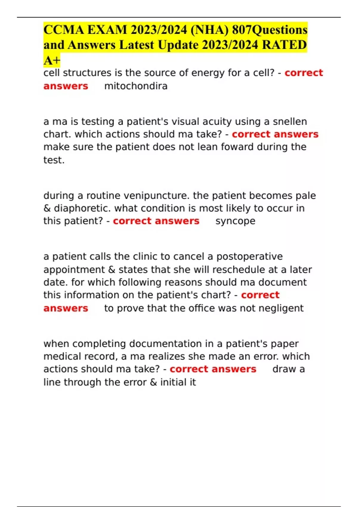 CCMA EXAM 2023/2024 (NHA) 807Questions and Answers Latest Update 2023/2024 RATED A+