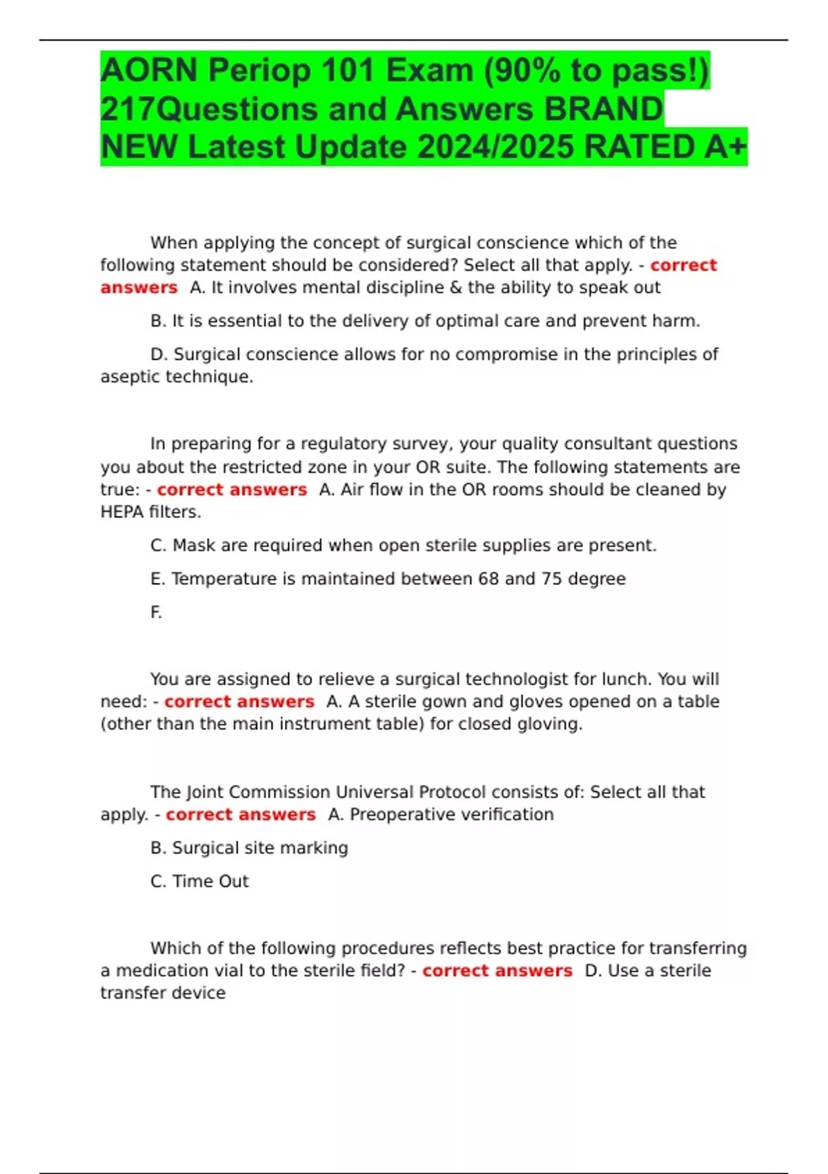 AORN Periop 101 Exam (90% to pass!) 217Questions and Answers BRAND NEW Latest Update 2024/2025 RATED A+