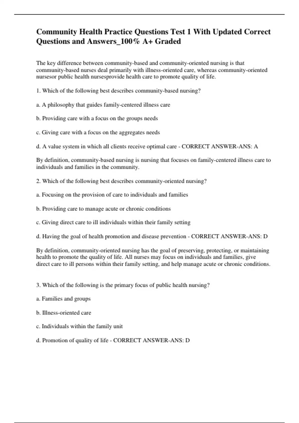 Community Health Practice Questions Test 1 With Updated Correct Questions and Answers_100% A+ Graded The key difference between community-based and community-oriented nursing is that community-based nurses deal primarily with illness-oriented care, whereas community-oriented nursesor public health nursesprovide health care to promote quality of life. 1. Which of the following best describes community-based nursing? a. A philosophy that guides family-centered illness care b. Providing care with a focus on the groups needs c. Giving care with a focus on the aggregates needs d. A value system in which all clients receive optimal care - CORRECT ANSWER-ANS: A By definition, community-based nursing is nursing that focuses on family-centered illness care to individuals and families in the community. 2. Which of the following best describes community-oriented nursing? a. Focusing on the provision of care to individuals and families b. Providing care to manage acute or chronic conditions c. Giving direct care to ill individuals within their family setting d. Having the goal of health promotion and disease prevention - CORRECT ANSWER-ANS: D By definition, community-oriented nursing has the goal of preserving, protecting, or maintaining health to promote the quality of life. All nurses may focus on individuals and families, give direct care to ill persons within their family setting, and help manage acute or chronic conditions. 3. Which of the following is the primary focus of public health nursing? a. Families and groups b. Illness-oriented care c. Individuals within the family unit d. Promotion of quality of life - CORRECT ANSWER-ANS: D 4. Which of the following is responsible for the dramatic increase in life expectancy during the twentieth century? a. Technology increases in the field of medical laboratory research b. Advances in surgical techniques and procedures c. Sanitation and other public health activities d. Use of antibiotics to fight infections - CORRECT ANSWER-ANS: C Improvement in control of infectious diseases through immunizations, sanitation, and other public health activities led to the increase in life expectancy from less than 50 years in 1900 to more than 77 years in 2002. 5. A nurse is developing a plan to decrease the number of premature deaths in the community. Which of the following interventions would most likely be implemented by the nurse? a. Increase the communitys knowledge about hospice care. b. Promote healthy lifestyle behavior choices among the community members. c. Encourage employers to have wellness centers at each industrial site. d. Ensure timely and effective medical intervention and treatment for community members. - CORRECT ANSWER-ANS: B Public health approaches could help prevent about 70% of early deaths by influencing the way people eat, drink, drive, engage in exercise, and treat the environment. 6. Which of the following is a basic assumption of public health efforts? a. Health disparities among any groups are morally and legally wrong. b. Health care is the most important priority in government planning and funding. c. The health of individuals cannot be separated from the health of the community. d. The government is responsible for lengthening the life span of Americans. - CORRECT ANSWER-ANS: C Public health can be described as what society collectively does to ensure that conditions exist in which people can be healthy. 7. Which of the following actions would most likely be performed by a public health nurse? a. Asking community leaders what interventions should be chosen b. Assessing the community and deciding on appropriate interventions c. Using data from the main health care institutions in the community to determine needed health services d. Working with community groups to create policies to improve the environment - CORRECT ANSWER-ANS: D Although the public health nurse might engage in any of the tasks listed, he or she works primarily with members of the community to carry out core public health functions, including assessment of the population as a whole and engaging in promoting health and improving the environment. 8. Which of the following public health nurses most clearly fulfills the responsibilities of this role? a. The nurse who met with several groups to discuss community recreation issues b. The nurse who spent the day attending meetings of various health agencies c. The nurse who talked to several people about their particular health concerns d. The nurse who watched the city council meeting on local cable television - CORRECT ANSWER-ANS: B Any of these descriptions might represent a nurse communicating, cooperating, or collaborating with community residents or groups about health concerns. However, the nurse who spent the day attending meetings of various health agencies is the most representative, because in public health, concerns are broader than recreation, individual concerns are not as important as aggregate priorities, and watching television (a one-way form of communication) is less effective than interacting with others. 9. Which of the following best defines aggregate? a. A large group of persons b. A collection of individuals and families c. A group of persons who share one or more characteristics d. Another name for demographic group - CORRECT ANSWER-ANS: C An aggregate is defined as a collection of people who share one or more personal or environmental characteristics, such as geography or special interest.