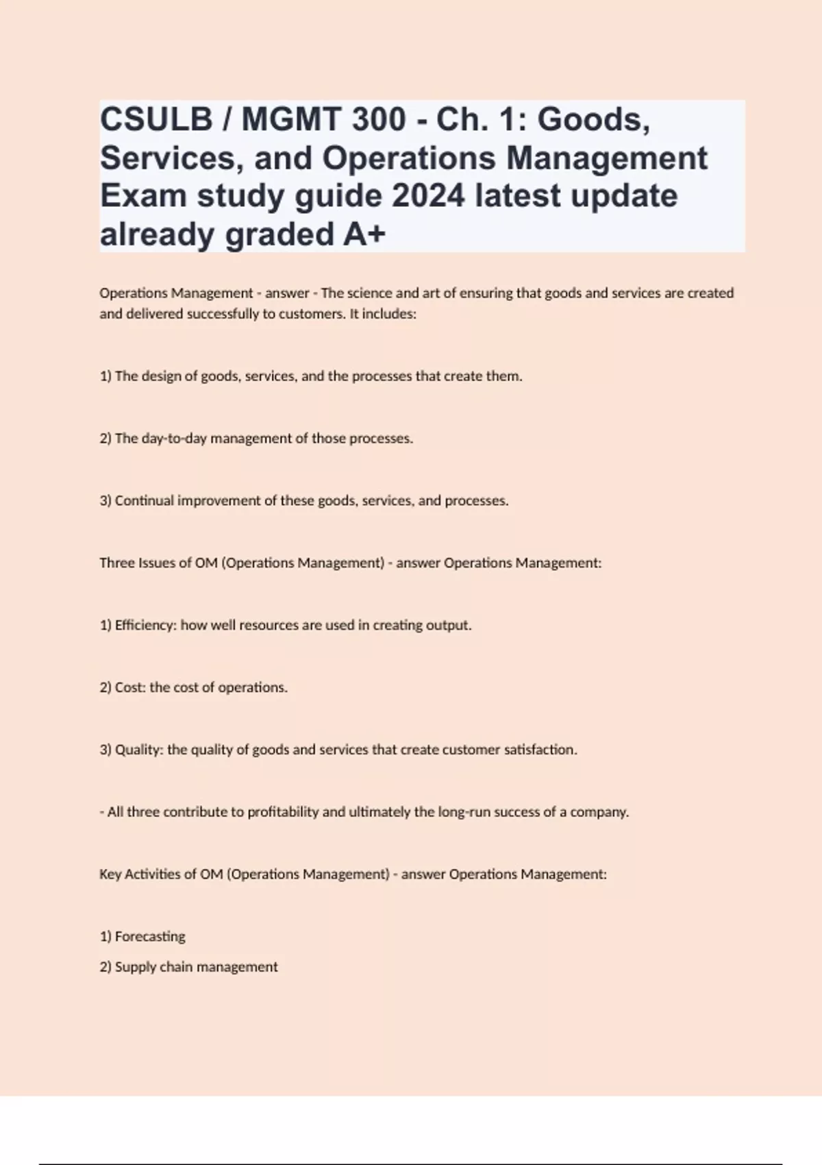 CSULB / MGMT 300 - Ch. 1: Goods, Services, and Operations Management Exam study guide 2024 latest update already graded A+