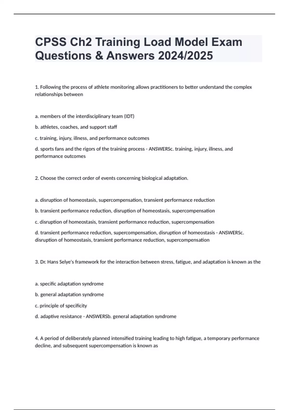 CPSS Ch2 Training Load Model Exam Questions & Answers 2024/2025 1. Following the process of athlete monitoring allows practitioners to better understand the complex relationships between a. members of the interdisciplinary team (IDT) b. athletes, coaches, and support staff c. training, injury, illness, and performance outcomes d. sports fans and the rigors of the training process - ANSWERSc. training, injury, illness, and performance outcomes 2. Choose the correct order of events concerning biological adaptation. a. disruption of homeostasis, supercompensation, transient performance reduction b. transient performance reduction, disruption of homeostasis, supercompensation c. disruption of homeostasis, transient performance reduction, supercompensation d. transient performance reduction, supercompensation, disruption of homeostasis - ANSWERSc. disruption of homeostasis, transient performance reduction, supercompensation 3. Dr. Hans Selye's framework for the interaction between stress, fatigue, and adaptation is known as the a. specific adaptation syndrome b. general adaptation syndrome c. principle of specificity d. adaptive resistance - ANSWERSb. general adaptation syndrome 4. A period of deliberately planned intensified training leading to high fatigue, a temporary performance decline, and subsequent supercompensation is known as