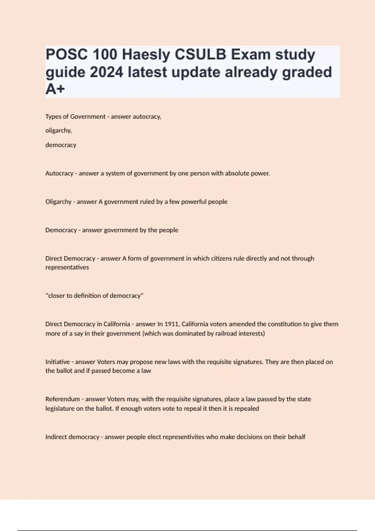 POSC 100 Haesly CSULB Exam study guide 2024 latest update already graded A+