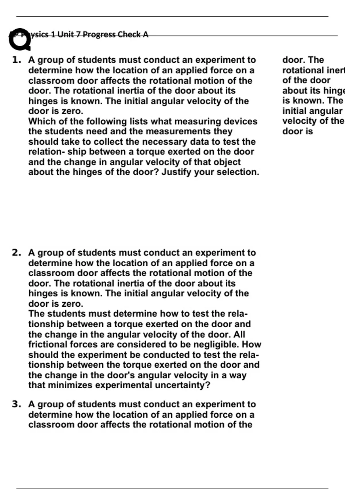 AP Physics 1 Unit 7 Progress Check A and B Q&A. AP Physics 1 Unit 7 Progress Check A A group of students must conduct an experiment to determine how the location of an applied force on a classroom door affects the rotational motion of the door. The rotational inertia of the door about its hinge