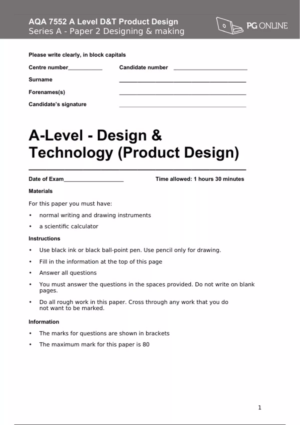 Please write clearly, in block capitals Centre number Candidate number Surname Forenames(s) Candidate’s signature A-Level - Design & Technology (Product Design) Date of Exam Time allowed: 1 hours 30 minutes Materials For this paper you must have: •normal writing and drawing instruments •a scientific calculator Instructions •Use black ink or black ball-point pen. Use pencil only for drawing. •Fill in the information at the top of this page •Answer all questions •You must answer the questions in the spaces provided. Do not write on blank pages. •Do all rough work in this paper. Cross through any work that you do not want to be marked. Information •The marks for questions are shown in brackets •The maximum mark for this paper is 80 SECTION A 1.Figure 1 and Figure 2 show two alternative craft knives. Figure 1 Figure 2 Nylon and elastomer craft knife Stainless steel craft knife Compare how each craft knife has been designed and manufactured to meet the needs of the end user. [8 marks] 2.It is common practice to use handmade measuring, marking or cutting aids to increase efficiency in the manufacture of batch produced, handmade wooden toys such as the toy plane shown below. Upper wing Strut Plane body Lower wing Explain how the two following operations could be made more efficient with the use of handmade aids. (a)Marking and cutting aid for the locating the positions of the struts between the upper and lower wings. [3 marks] (b)Measuring and marking the shape of the plane body. [3 marks] 3.Marianne Brandt is one of the most famous designers to have studied at the Bauhaus school. Analyse and explain the key principles of the Bauhaus movement with reference to the work of Marianne Brandt.