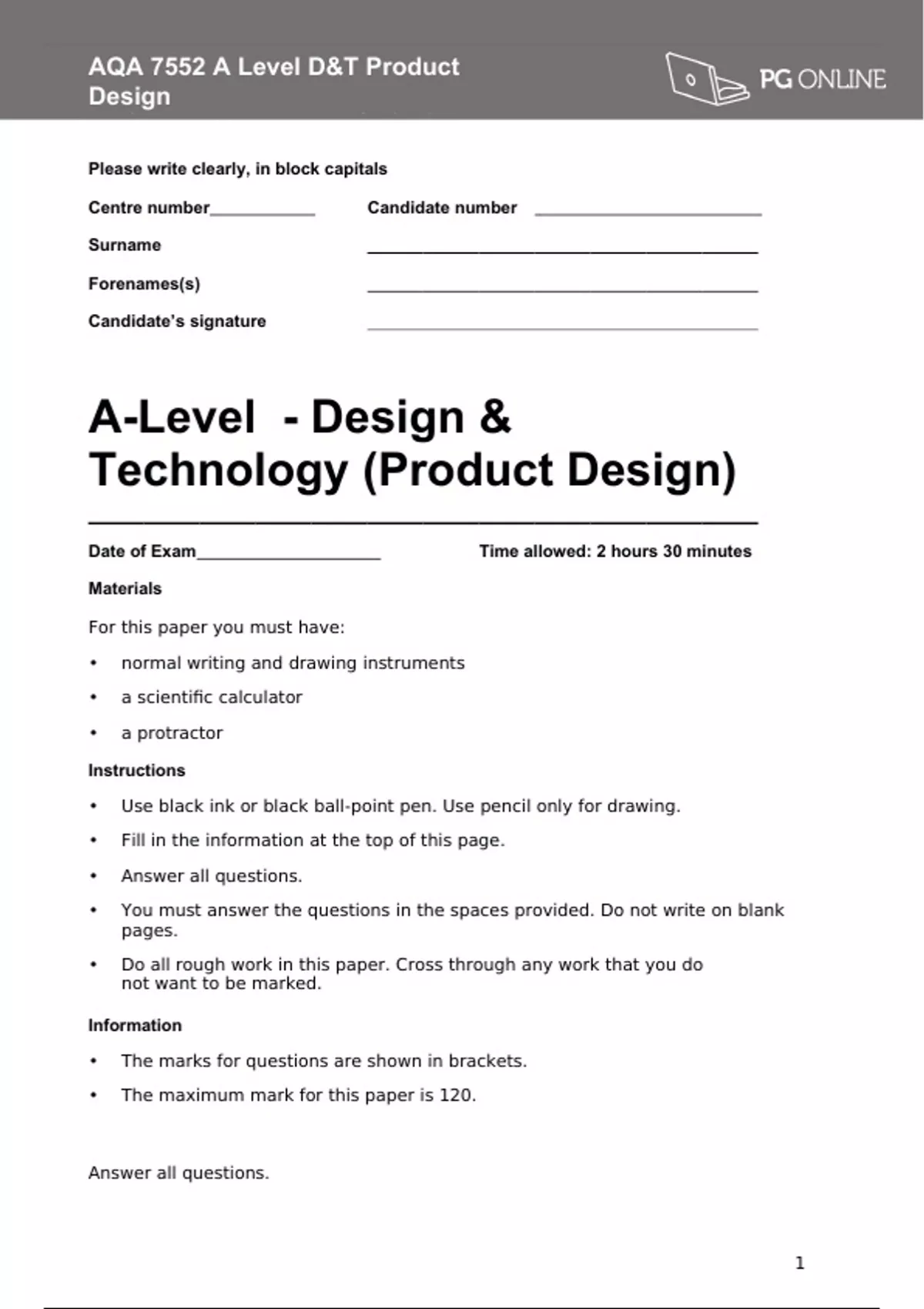 Please write clearly, in block capitals Centre number Candidate number Surname Forenames(s) Candidate’s signature A-Level - Design & Technology (Product Design) Date of Exam Time allowed: 2 hours 30 minutes Materials For this paper you must have: •normal writing and drawing instruments •a scientific calculator •a protractor Instructions •Use black ink or black ball-point pen. Use pencil only for drawing. •Fill in the information at the top of this page. •Answer all questions. •You must answer the questions in the spaces provided. Do not write on blank pages. •Do all rough work in this paper. Cross through any work that you do not want to be marked. Information •The marks for questions are shown in brackets. •The maximum mark for this paper is 120. Answer all questions. 1.The table below gives details of four specific papers and boards and a suitable application of use for each. Specific paper or board Suitable application of use Bleed proof paper Marker rendering of design ideas Corrugated card Retail packaging for a TV Foil backed card Drinks carton Mount board Model making Describe the performance characteristics that make each paper or board suitable for each identified application. [8 marks] Bleed proof paper Corrugated card Foil backed card Mount board 2.Explain the meaning of the term 'wastage' in relation to manufacturing. [2 marks] 3.Harnessing renewable energy in the UK is rapidly rising to meet demand. The bar chart below shows the change in renewable energy use in the UK in recent years. (a)Calculate the percentage of solar PV used in 2015. Round your answer to the nearest whole number. [2 marks] Solar PV (b)Complete the pie chart below by adding the remaining data and labels for PV solar and Offshore wind for the year 2015. [4 marks] 4.Study the picture below which shows an item of flat-pack bedroom furniture made from manufactured boards. (a)Name one specific manufactured board in the construction of the product above. [1 mark] Manufactured board: (b)Give the specific width and length of a standard full-size sheet of manufactured board in millimetres. [1 mark]