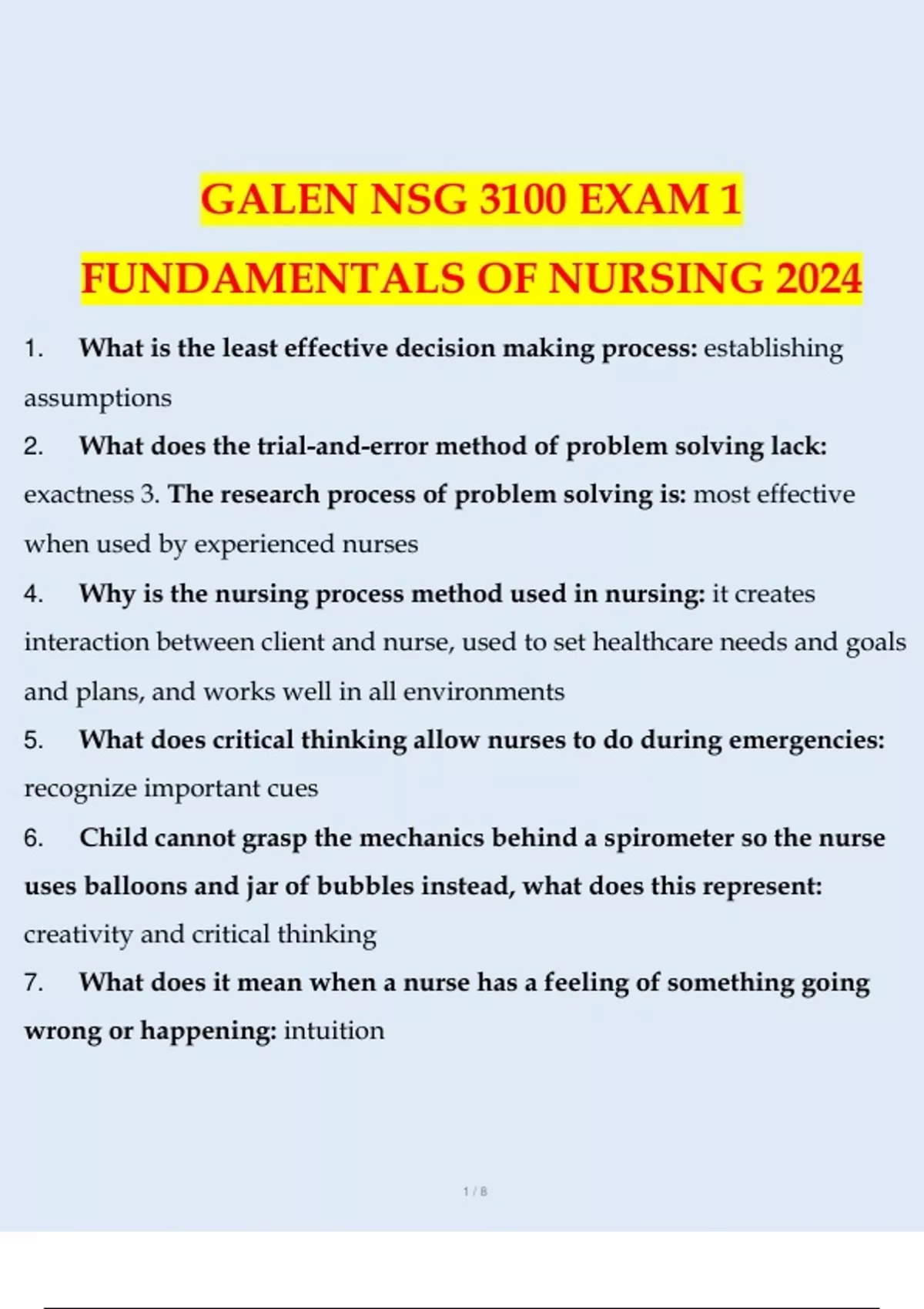 GALEN NSG 3100 EXAM 1 FUNDAMENTALS OF NURSING 2024