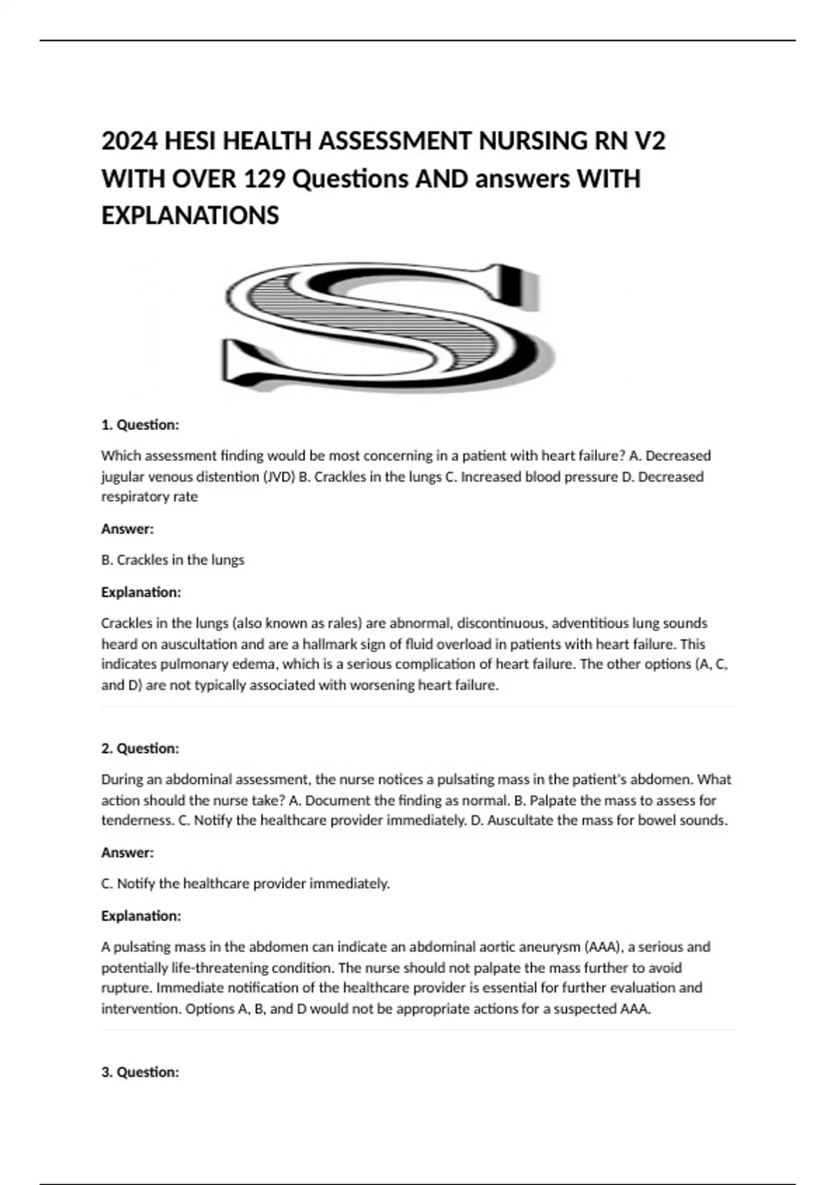 2024 HESI HEALTH ASSESSMENT NURSING RN V2 WITH OVER 129 Questions AND answers WITH EXPLANATIONS