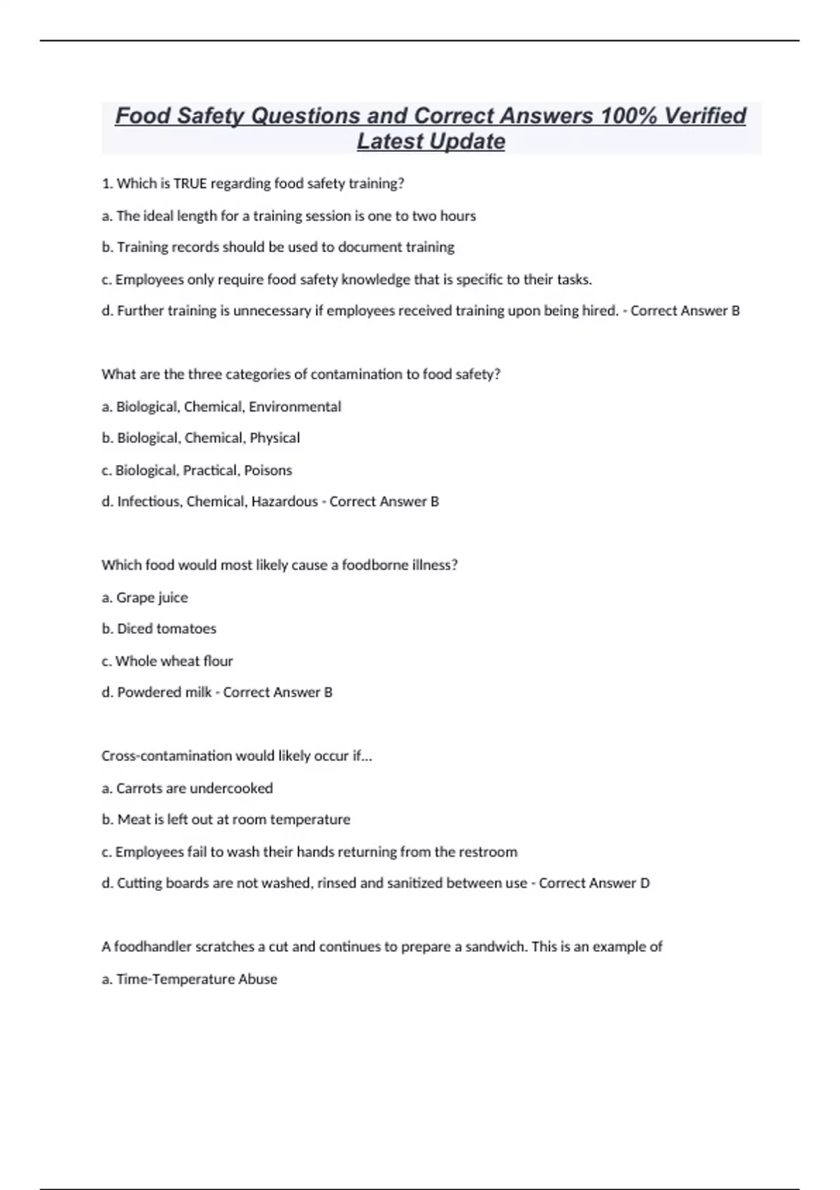 Food Safety Questions and Correct Answers 100% Verified Latest Update 1. Which is TRUE regarding food safety training? a. The ideal length for a training session is one to two hours b. Training records should be used to document training c. Employees only require food safety knowledge that is specific to their tasks. d. Further training is unnecessary if employees received training upon being hired. - Correct Answer B What are the three categories of contamination to food safety? a. Biological, Chemical, Environmental b. Biological, Chemical, Physical c. Biological, Practical, Poisons d. Infectious, Chemical, Hazardous - Correct Answer B Which food would most likely cause a foodborne illness? a. Grape juice b. Diced tomatoes c. Whole wheat flour d. Powdered milk - Correct Answer B Cross-contamination would likely occur if... a. Carrots are undercooked b. Meat is left out at room temperature c. Employees fail to wash their hands returning from the restroom d. Cutting boards are not washed, rinsed and sanitized between use - Correct Answer D A foodhandler scratches a cut and continues to prepare a sandwich. This is an example of a. Time-Temperature Abuse b. Poor Personal Hygiene