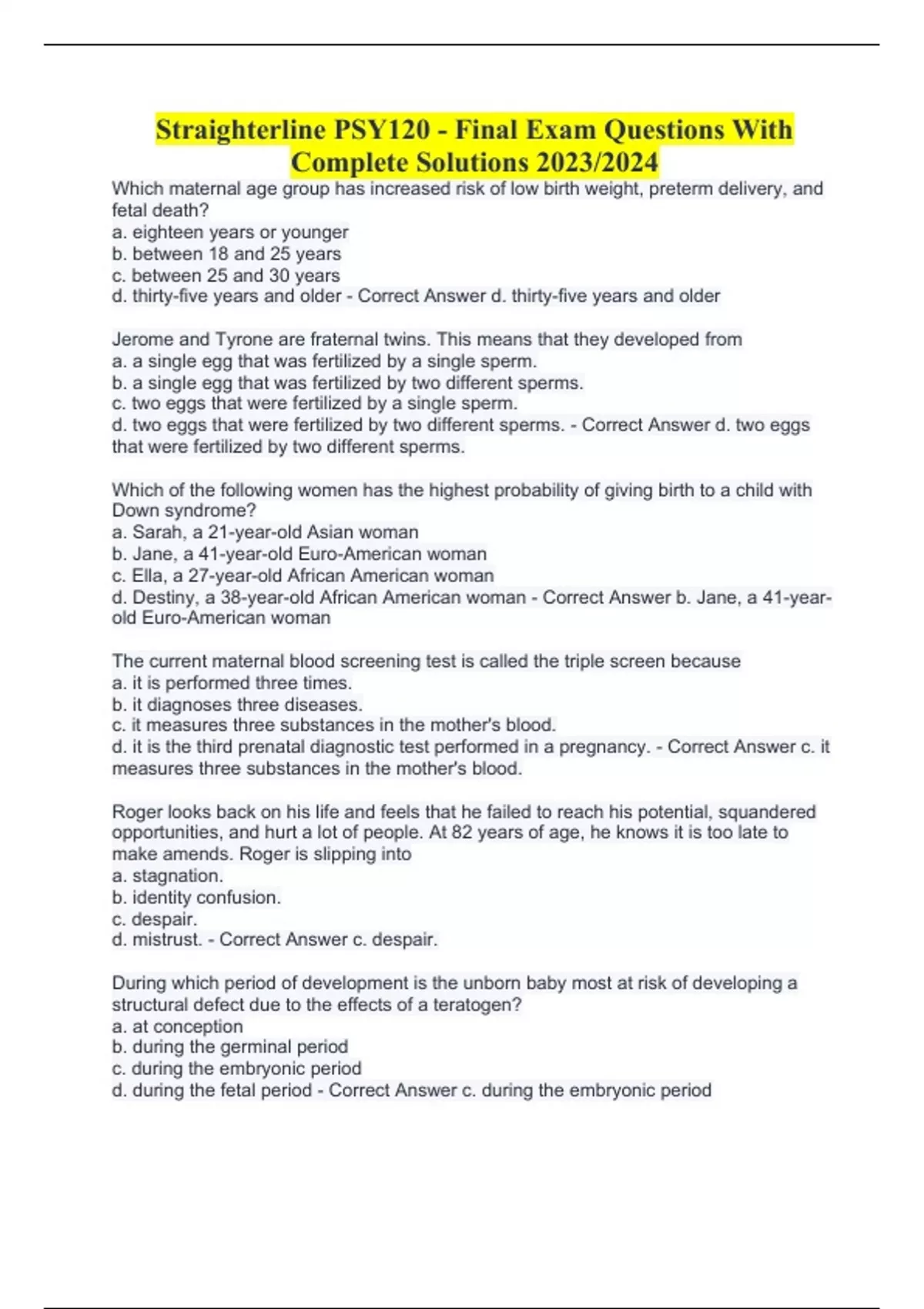 Which maternal age group has increased risk of low birth weight, preterm delivery, and fetal death? a. eighteen years or younger b. between 18 and 25 years c. between 25 and 30 years d. thirty-five years and older - Correct Answer d. thirty-five years and older Jerome and Tyrone are fraternal twins. This means that they developed from a. a single egg that was fertilized by a single sperm. b. a single egg that was fertilized by two different sperms. c. two eggs that were fertilized by a single sperm. d. two eggs that were fertilized by two different sperms. - Correct Answer d. two eggs that were fertilized by two different sperms. Which of the following women has the highest probability of giving birth to a child with Down syndrome? a. Sarah, a 21-year-old Asian woman b. Jane, a 41-year-old Euro-American woman c. Ella, a 27-year-old African American woman d. Destiny, a 38-year-old African American woman - Correct Answer b. Jane, a 41-year-old Euro-American woman The current maternal blood screening test is called the triple screen because a. it is performed three times. b. it diagnoses three diseases. c. it measures three substances in the mother's blood. d. it is the third prenatal diagnostic test performed in a pregnancy. - Correct Answer c. it measures three substances in the mother's blood. Roger looks back on his life and feels that he failed to reach his potential, squandered opportunities, and hurt a lot of people. At 82 years of age, he knows it is too late to make amends. Roger is slipping into a. stagnation. b. identity confusion. c. despair. d. mistrust. - Correct Answer c. despair. During which period of development is the unborn baby most at risk of developing a structural defect due to the effects of a teratogen? a. at conception b. during the germinal period c. during the embryonic period d. during the fetal period - Correct Answer c. during the embryonic period