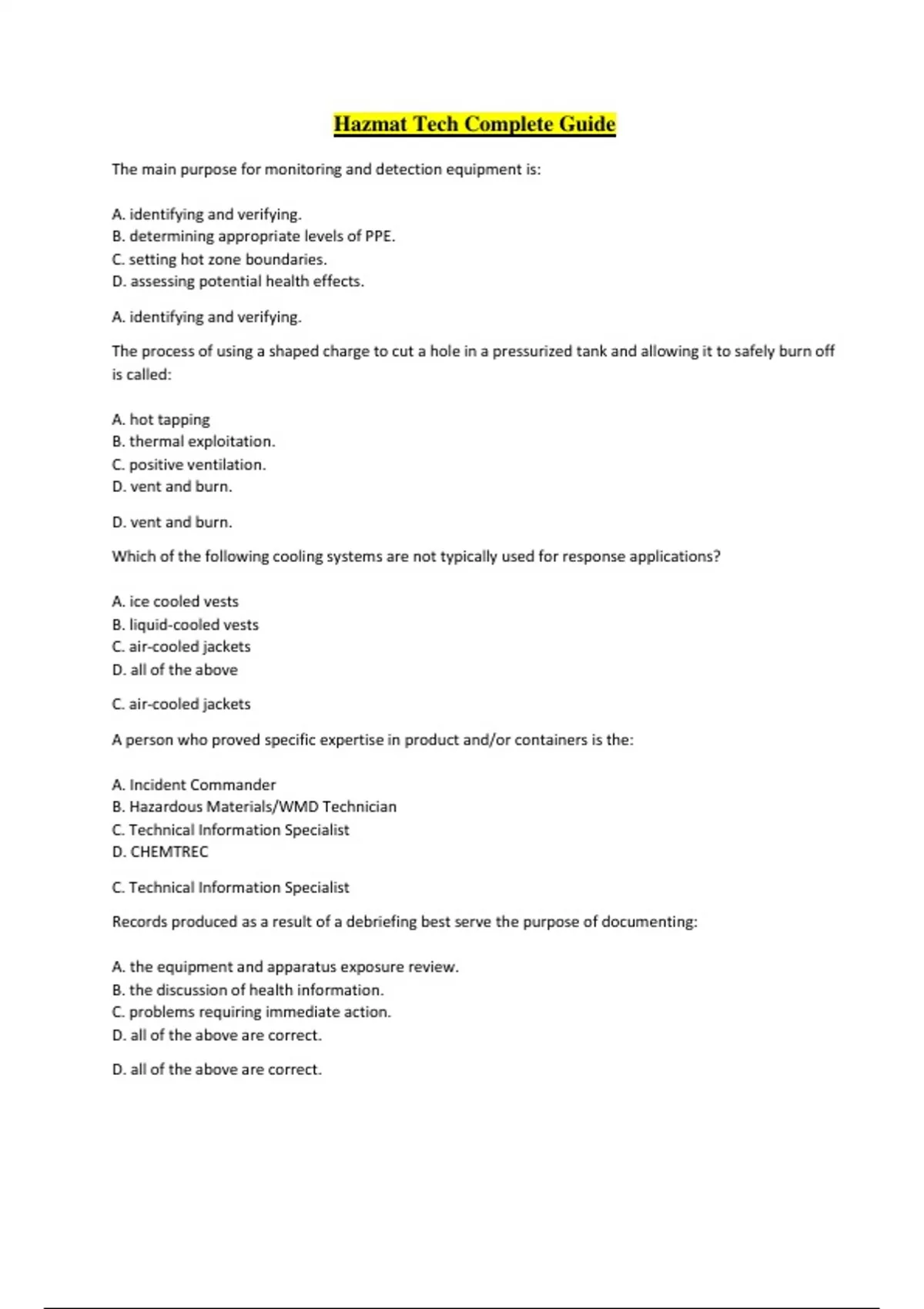 Hazmat Tech Complete Guide The main purpose for monitoring and detection equipment is: A. identifying and verifying. B. determining appropriate levels of PPE. C. setting hot zone boundaries. D. assessing potential health effects. A. identifying and verifying. The process of using a shaped charge to cut a hole in a pressurized tank and allowing it to safely burn off is called: A. hot tapping B. thermal exploitation. C. positive ventilation. D. vent and burn. D. vent and burn. Which of the following cooling systems are not typically used for response applications? A. ice cooled vests B. liquid-cooled vests C. air-cooled jackets D. all of the above C. air-cooled jackets A person who proved specific expertise in product and/or containers is the: A. Incident Commander B. Hazardous Materials/WMD Technician C. Technical Information Specialist D. CHEMTREC C. Technical Information Specialist Records produced as a result of a debriefing best serve the purpose of documenting: A. the equipment and apparatus exposure review. B. the discussion of health information. C. problems requiring immediate action. D. all of the above are correct. D. all of the above are correct. When dealing with radiation, it is important to remember this rule: When distance from the radiation source is doubled, the safety factor is increased by a margin of: A. two B. four C. six D. eight B. four When dealing with a radio-logical incident involving a leak or spill, what exposure guidelines should the Hazardous Materials/WMD Technician use to minimize radioactive contamination? A. Time, distance, half-life B. Ionizing radiation, non-ionizing radiation, half-life C. Time, distance, shielding D. Alpha particles, beta particles, gamma rays C. Time, distance, shielding __________is the taking of hazardous materials into the body through the skin and the eyes. A. Absorption B. Ingestion C. Inhalation D. Injection A. Absorption Directions: Read the statements below, then select your answer alternatives A-D below. Statement 1: Gamma radiation is the most difficult form of radiation to shield. Statement 2: Alpha radiation is not harmful to the body. Statement 3: Gamma radiation does not travel very far. A. All statements are true. B. Statement 1 is true; statements 2 and 3 are false. C. Statement 1 is false; statements 2 and 3 are true. D. Statements 1 and 2 are true; statement 3 is false. B. Statement 1 is true; statements 2 and 3 are false. When sampling air, _________ is the common reading used to determine exposure guidelines and values. A. PPH B. PPM C. PPB D. PPT B. PPM Radiation that can be stopped by a piece of paper is known as _________ particles.