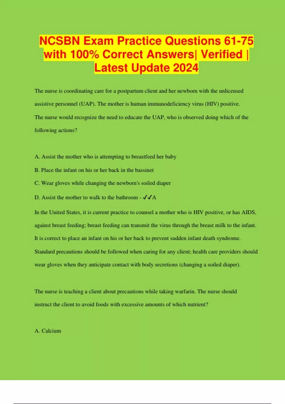 NCSBN Exam Practice Questions 61-75 with 100% Correct Answers| Verified | Latest Update 2024
