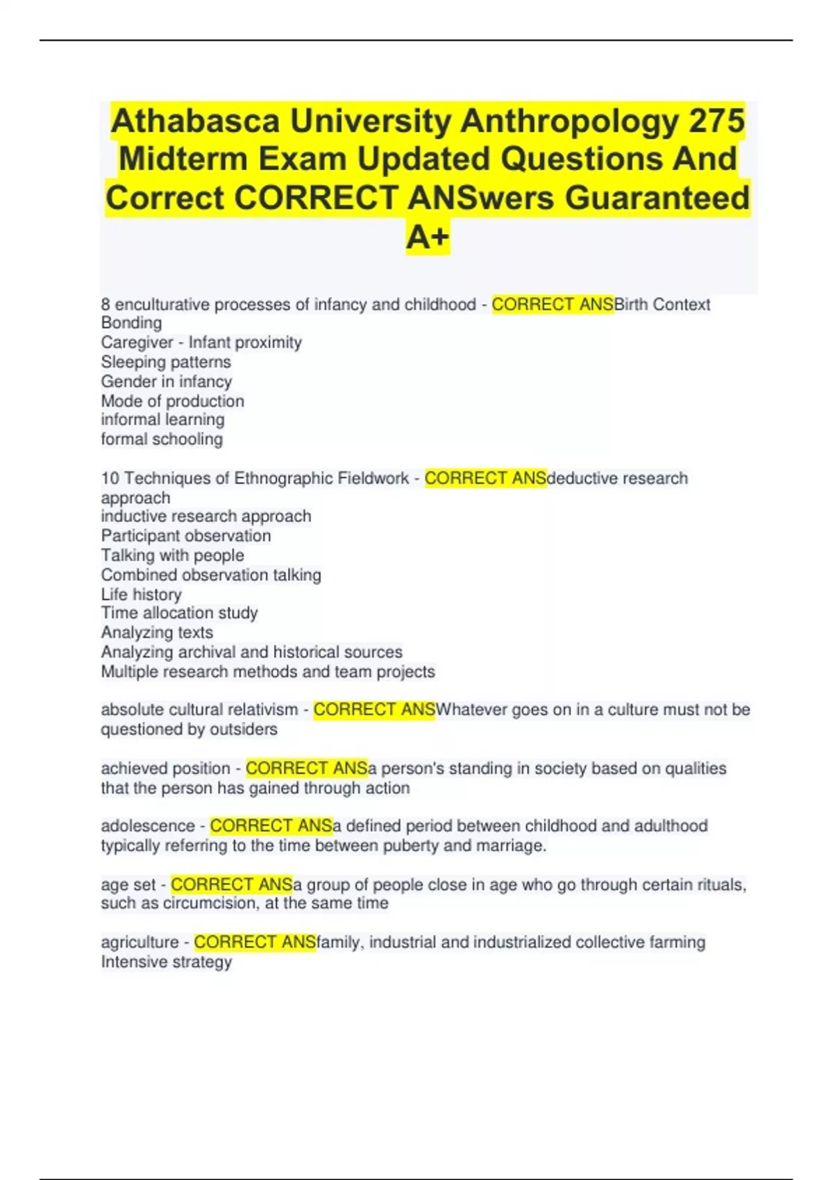 Athabasca University Anthropology 275 Midterm Exam Updated Questions And Correct CORRECT ANSwers Guaranteed A+