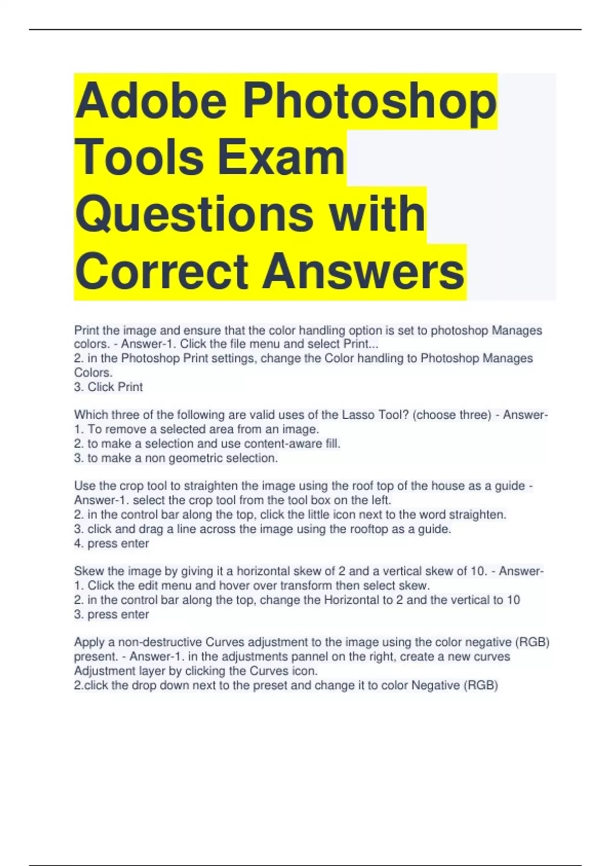 Adobe Photoshop Tools Exam Questions with Correct Answers Print the image and ensure that the color handling option is set to photoshop Manages colors. - Answer-1. Click the file menu and select Print... 2. in the Photoshop Print settings, change the Color handling to Photoshop Manages Colors. 3. Click Print Which three of the following are valid uses of the Lasso Tool? (choose three) - Answer- 1. To remove a selected area from an image. 2. to make a selection and use content-aware fill. 3. to make a non geometric selection. Use the crop tool to straighten the image using the roof top of the house as a guide - Answer-1. select the crop tool from the tool box on the left. 2. in the control bar along the top, click the little icon next to the word straighten. 3. click and drag a line across the image using the rooftop as a guide. 4. press enter Skew the image by giving it a horizontal skew of 2 and a vertical skew of 10. - Answer- 1. Click the edit menu and hover over transform then select skew. 2. in the control bar along the top, change the Horizontal to 2 and the vertical to 10 3. press enter Apply a non-destructive Curves adjustment to the image using the color negative (RGB) present. - Answer-1. in the adjustments pannel on the right, create a new curves Adjustment layer by clicking the Curves icon. the drop down next to the preset and change it to color Negative (RGB) use the lasso tool and content aware fill command to remove the woman from the beach. - Answer-1. select the Lasso tool from the tool box on the left and use it to draw around the woman on the beach. 2. Click the Edit menu and select fill. 3. under contents make sure it says use:content -aware, then click ok. Which of the following is NOT a phase involved in a project plan? - Answer-Budget discussion is NOT a phase involved in a project plan. use Styles presets to change the Blue rectangle to use the Puzzle (image) style. - Answer-1. select the layer with the blue rectangle 2. Open the Styles panel. 3. select the Puzzle (image) style.