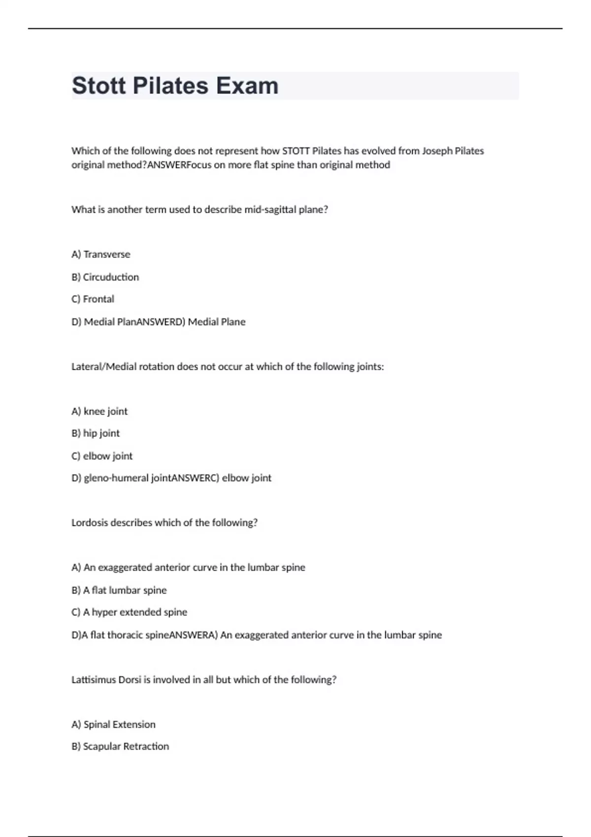 Stott Pilates Exam Questions And Answers 2024 (GRADED A+)