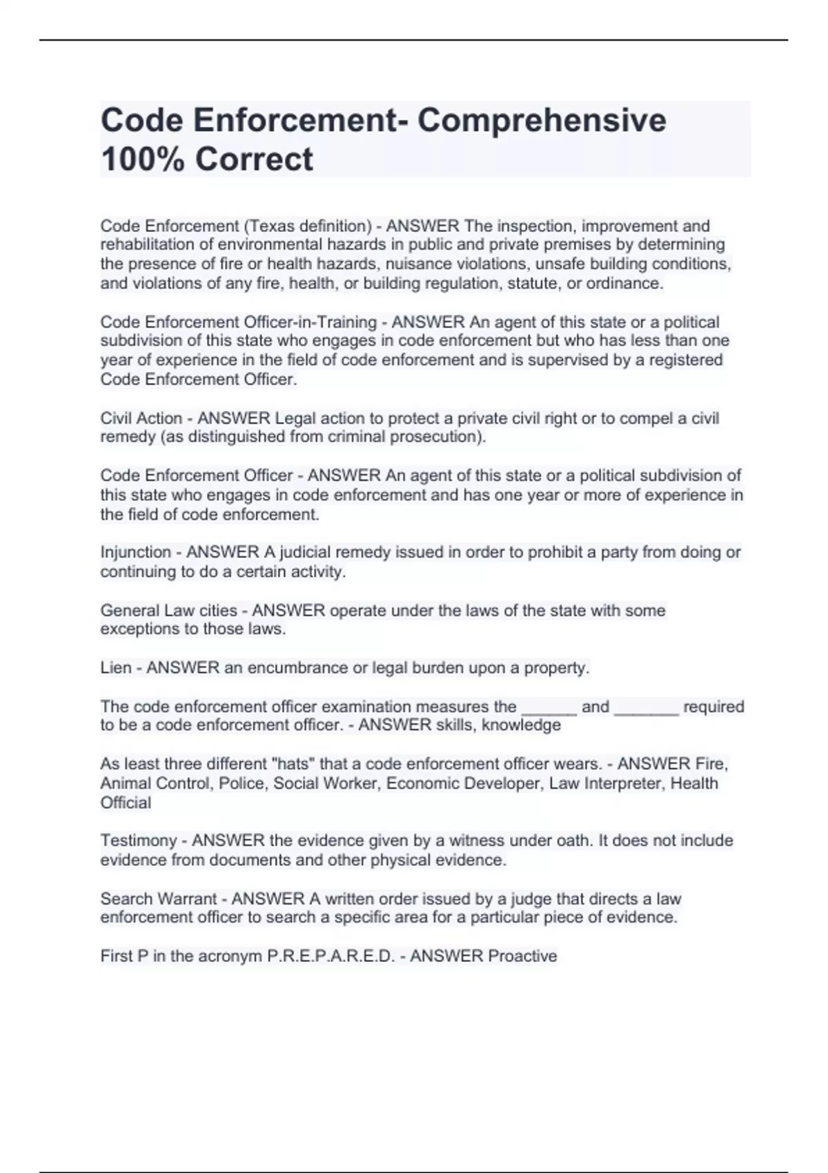 Code Enforcement (Texas definition) - ANSWER The inspection, improvement and rehabilitation of environmental hazards in public and private premises by determining the presence of fire or health hazards, nuisance violations, unsafe building conditions, and violations of any fire, health, or building regulation, statute, or ordinance. Code Enforcement Officer-in-Training - ANSWER An agent of this state or a political subdivision of this state who engages in code enforcement but who has less than one year of experience in the field of code enforcement and is supervised by a registered Code Enforcement Officer. Civil Action - ANSWER Legal action to protect a private civil right or to compel a civil remedy (as distinguished from criminal prosecution). Code Enforcement Officer - ANSWER An agent of this state or a political subdivision of this state who engages in code enforcement and has one year or more of experience in the field of code enforcement. Injunction - ANSWER A judicial remedy issued in order to prohibit a party from doing or continuing to do a certain activity. General Law cities - ANSWER operate under the laws of the state with some exceptions to those laws. Lien - ANSWER an encumbrance or legal burden upon a property. The code enforcement officer examination measures the ______ and _______ required to be a code enforcement officer. - ANSWER skills, knowledge As least three different "hats" that a code enforcement officer wears. - ANSWER Fire, Animal Control, Police, Social Worker, Economic Developer, Law Interpreter, Health Official