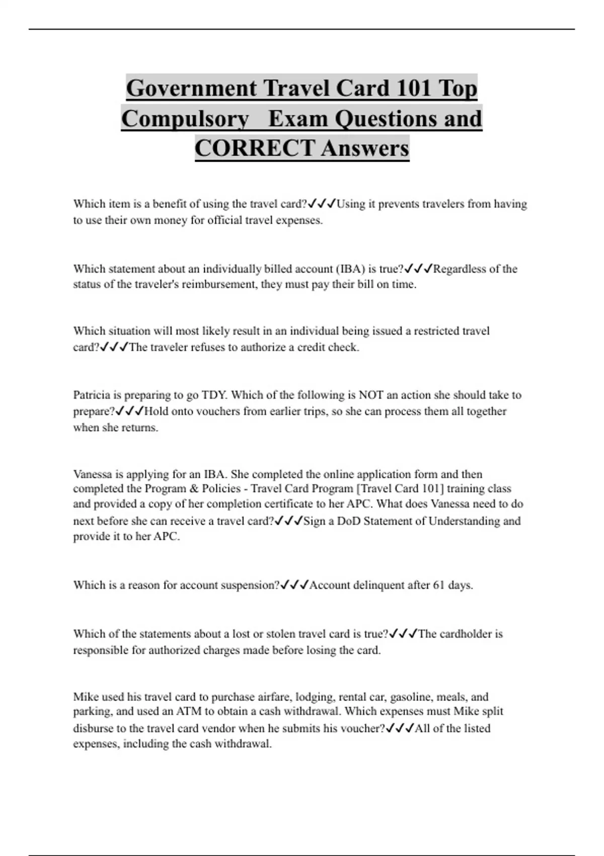 Government Travel Card 101 Top Compulsory Exam Questions and CORRECT Answers