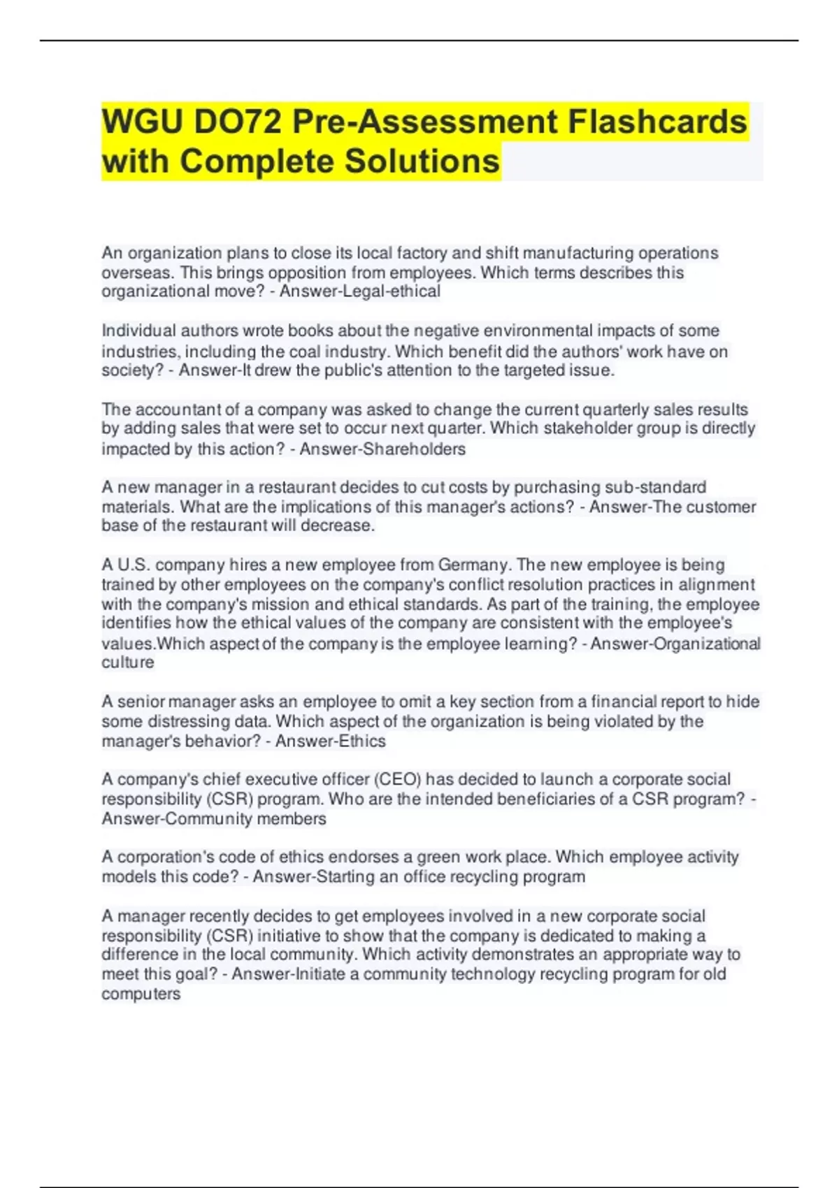 WGU DO72 Pre-Assessment Flashcards with Complete Solutions An organization plans to close its local factory and shift manufacturing operations overseas. This brings opposition from employees. Which terms describes this organizational move? - Answer-Legal-ethical Individual authors wrote books about the negative environmental impacts of some industries, including the coal industry. Which benefit did the authors' work have on society? - Answer-It drew the public's attention to the targeted issue. The accountant of a company was asked to change the current quarterly sales results by adding sales that were set to occur next quarter. Which stakeholder group is directly impacted by this action? - Answer-Shareholders A new manager in a restaurant decides to cut costs by purchasing sub-standard materials. What are the implications of this manager's actions? - Answer-The customer base of the restaurant will decrease. A U.S. company hires a new employee from Germany. The new employee is being trained by other employees on the company's conflict resolution practices in alignment with the company's mission and ethical standards. As part of the training, the employee identifies how the ethical values of the company are consistent with the employee's values.Which aspect of the company is the employee learning? - Answer-Organizational culture A senior manager asks an employee to omit a key section from a financial report to hide some distressing data. Which aspect of the organization is being violated by the manager's behavior? - Answer-Ethics