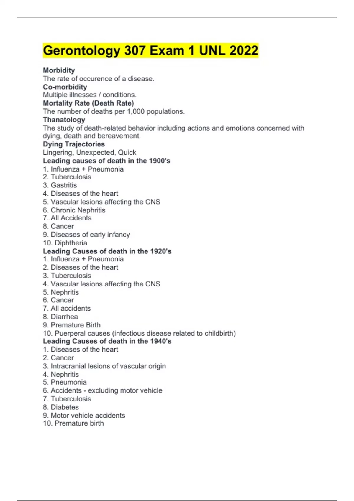 Gerontology 307 Exam 1 UNL 2022 Morbidity The rate of occurence of a disease. Co-morbidity Multiple illnesses / conditions. Mortality Rate (Death Rate) The number of deaths per 1,000 populations. Thanatology The study of death-related behavior including actions and emotions concerned with dying, death and bereavement. Dying Trajectories Lingering, Unexpected, Quick Leading causes of death in the 1900's 1. Influenza + Pneumonia 2. Tuberculosis 3. Gastritis 4. Diseases of the heart 5. Vascular lesions affecting the CNS 6. Chronic Nephritis 7. All Accidents 8. Cancer 9. Diseases of early infancy 10. Diphtheria Leading Causes of death in the 1920's 1. Influenza + Pneumonia 2. Diseases of the heart 3. Tuberculosis 4. Vascular lesions affecting the CNS 5. Nephritis 6. Cancer 7. All accidents 8. Diarrhea 9. Premature Birth 10. Puerperal causes (infectious disease related to childbirth) Leading Causes of death in the 1940's 1. Diseases of the heart 2. Cancer 3. Intracranial lesions of vascular origin 4. Nephritis 5. Pneumonia 6. Accidents - excluding motor vehicle 7. Tuberculosis 8. Diabetes 9. Motor vehicle accidents 10. Premature birth Leading Causes of death in the 1960's 1. Diseases of the heart 2. Cancer 3. Vascular lesions affecting the CNS 4. Accidents (Less Motor) 5. Certain diseases of early infancy 6. Influenza and pneumonia 7. General arteriosclerosis 8. Diabetes mellitus 9. Congenital malformations 10. Cirrhosis of the liver Leading Causes of death in the 1980's 1. Diseases of the heart 2. Cancer 3. Cerebrovascular disease 4. Accidents (More Motor) 5. COPD 6. Influenza and pneumonia 7. Diabetes Mellitus 8. Chronic liver disease and cirrhosis 9. Atherosclerosis 10. Suicide Leading Causes of death 2019 1. Heart Disease 2. Malignant Neoplasms 3. Unintentional injury 4. Chronic, low, respiratory disease 5. Cerebrovascular disease 6. Alzheimer's Disease 7. Diabetes 8. Nephritis 9. Influenza & pneumonia 10. Suicide Leading Causes of death 2020 1. Heart Disease 2. Malignant Neoplasms 3. COVID-19 4. Unintentional injury 5. Cerebrovascular disease 6. Chronic, low, respiratory disease 7. Alzheimer's Disease 8. Diabetes 9. Influenza & pneumonia 10. Nephritis Euthanasia Defined