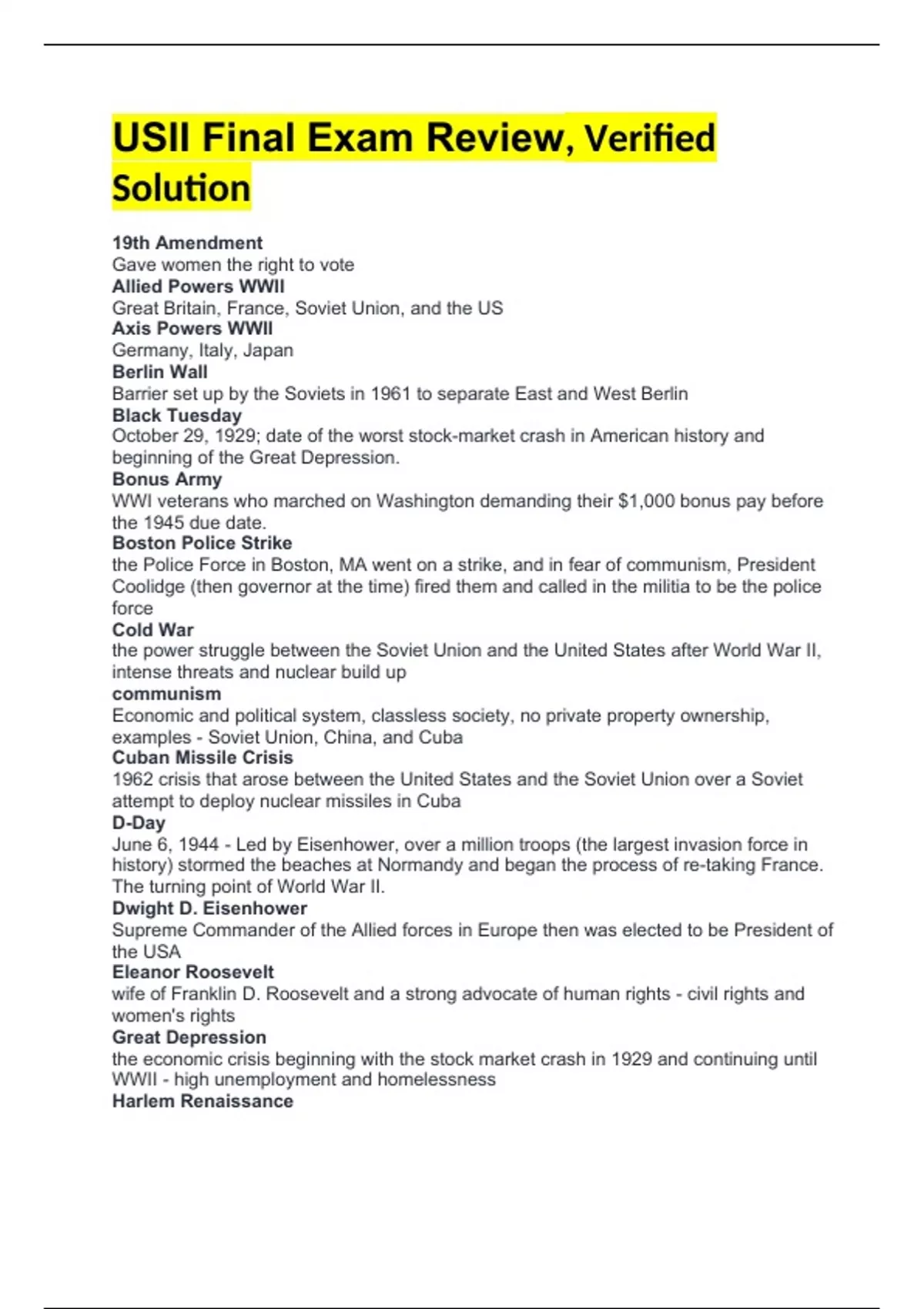 USII Final Exam Review, Verified Solution 19th Amendment Gave women the right to vote Allied Powers WWII Great Britain, France, Soviet Union, and the US Axis Powers WWII Germany, Italy, Japan Berlin Wall Barrier set up by the Soviets in 1961 to separate East and West Berlin Black Tuesday October 29, 1929; date of the worst stock-market crash in American history and beginning of the Great Depression. Bonus Army WWI veterans who marched on Washington demanding their $1,000 bonus pay before the 1945 due date. Boston Police Strike the Police Force in Boston, MA went on a strike, and in fear of communism, President Coolidge (then governor at the time) fired them and called in the militia to be the police force Cold War the power struggle between the Soviet Union and the United States after World War II, intense threats and nuclear build up communism Economic and political system, classless society, no private property ownership, examples - Soviet Union, China, and Cuba Cuban Missile Crisis 1962 crisis that arose between the United States and the Soviet Union over a Soviet attempt to deploy nuclear missiles in Cuba D-Day June 6, 1944 - Led by Eisenhower, over a million troops (the largest invasion force in history) stormed the beaches at Normandy and began the process of re-taking France. The turning point of World War II. Dwight D. Eisenhower Supreme Commander of the Allied forces in Europe then was elected to be President of the USA Eleanor Roosevelt wife of Franklin D. Roosevelt and a strong advocate of human rights - civil rights and women's rights Great Depression the economic crisis beginning with the stock market crash in 1929 and continuing until WWII - high unemployment and homelessness Harlem Renaissance