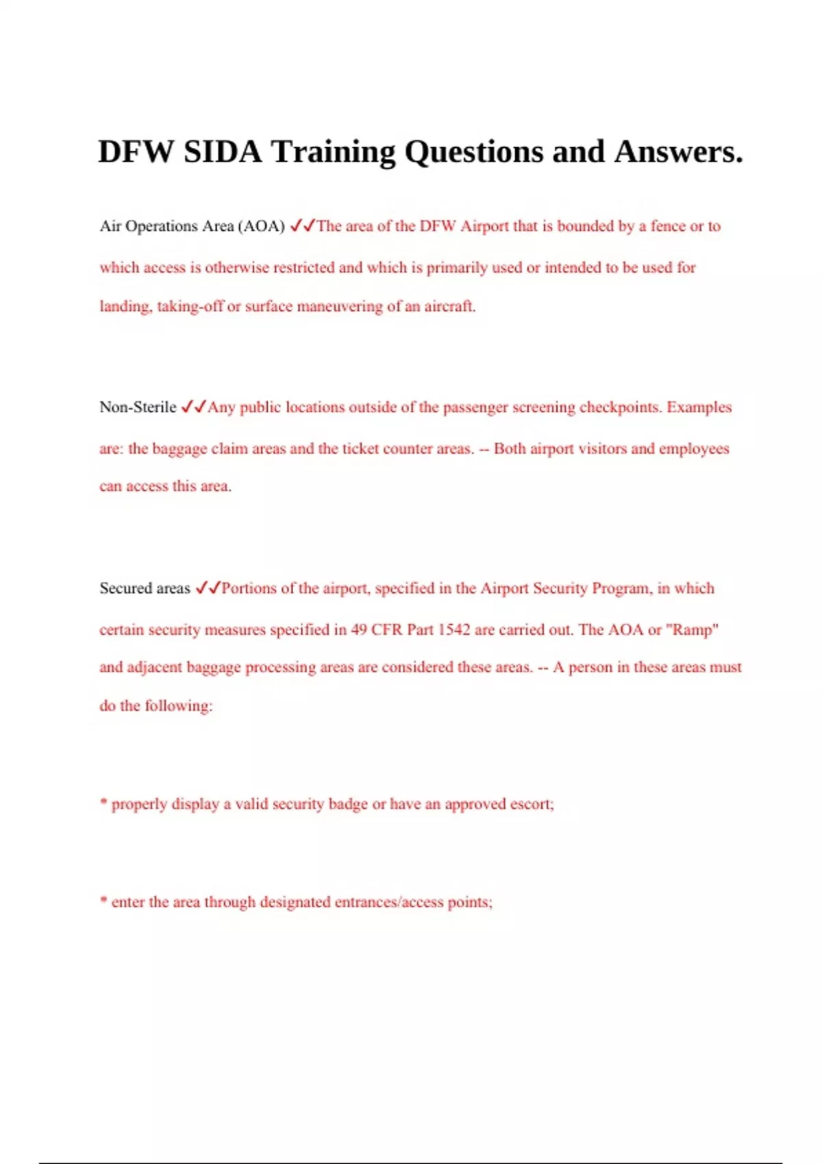 DFW SIDA Training Questions and Answers. Air Operations Area (AOA) The area of the DFW Airport that is bounded by a fence or to which access is otherwise restricted and which is primarily used or intended to be used for landing, taking-off or surface maneuvering of an aircraft. Non-Sterile Any public locations outside of the passenger screening checkpoints. Examples are: the baggage claim areas and the ticket counter areas. -- Both airport visitors and employees can access this area. Secured areas Portions of the airport, specified in the Airport Security Program, in which certain security measures specified in 49 CFR Part 1542 are carried out. The AOA or "Ramp" and adjacent baggage processing areas are considered these areas. -- A person in these areas must do the following: * properly display a valid security badge or have an approved escort; * enter the area through designated entrances/access points; DFW SIDA Training Questions and Answers. * exit the area through designated exits/access points. Security Identification Display Area (SIDA) A portion of the airport, specified in the Airport Security Program, in which security measures specified in 49 CFR Part 1450 are carried out. This area includes the Secured area and the AOA. * The baggage make-up areas beneath the terminal buildings (where baggage is sorted, loaded and unloaded) is considered part of the area. * NOTE: Jet bridges are not considered as designated entrance points. Sterile area The portion of an airport terminal accessible to the travelling public that is controlled through the screening of persons and property and provides passengers access to boarding aircraft. * Screening checkpoints use badge readers, automated imaging technology, metal detectors, xray machines and other security devices to screen access of persons and property. * Only ticketed passengers and DFW Airport badge holders who are authorized for this area access may enter. * NOTE: Failure to comply with this area's access requirements may lead to criminal arrest. Restricted area Any area locked or posted by the airport to either prohibit or limit entry or access to specific authorized persons. * This area includes the Secured areas, the Air Operations Area (AOA) and the Security Identification Display Area (SIDA). Transportation Security Administration (TSA) Federal agency with responsibility to: * establish, publish, enforce and monitor aviation security regulations; and * conduction passenger screening operations at airports.