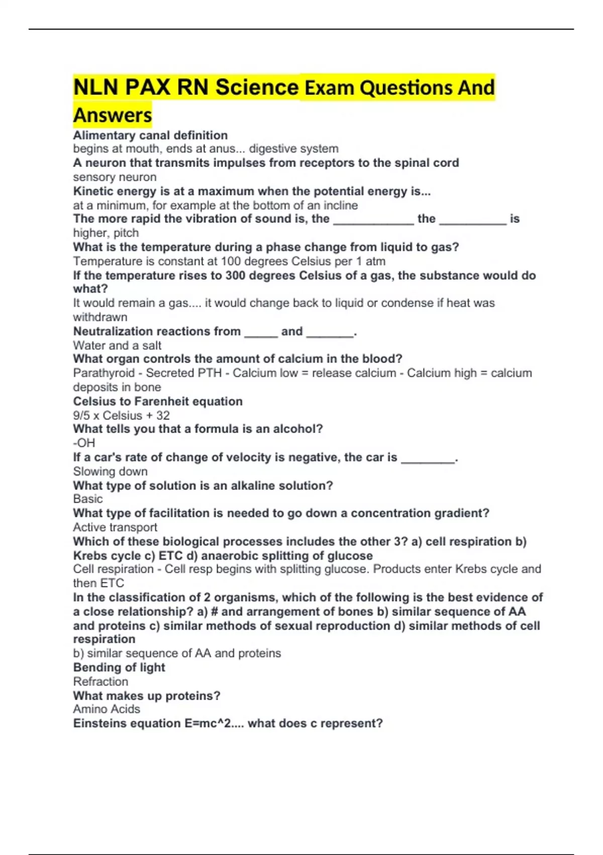 NLN PAX RN Science Exam Questions And Answers Alimentary canal definition begins at mouth, ends at anus... digestive system A neuron that transmits impulses from receptors to the spinal cord sensory neuron Kinetic energy is at a maximum when the potential energy is... at a minimum, for example at the bottom of an incline The more rapid the vibration of sound is, the ____________ the __________ is higher, pitch What is the temperature during a phase change from liquid to gas? Temperature is constant at 100 degrees Celsius per 1 atm If the temperature rises to 300 degrees Celsius of a gas, the substance would do what? It would remain a gas.... it would change back to liquid or condense if heat was withdrawn Neutralization reactions from _____ and _______. Water and a salt What organ controls the amount of calcium in the blood? Parathyroid - Secreted PTH - Calcium low = release calcium - Calcium high = calcium deposits in bone Celsius to Farenheit equation 9/5 x Celsius + 32 What tells you that a formula is an alcohol? -OH If a car's rate of change of velocity is negative, the car is ________. Slowing down What type of solution is an alkaline solution? Basic What type of facilitation is needed to go down a concentration gradient? Active transport Which of these biological processes includes the other 3? a) cell respiration b) Krebs cycle c) ETC d) anaerobic splitting of glucose Cell respiration - Cell resp begins with splitting glucose. Products enter Krebs cycle and then ETC In the classification of 2 organisms, which of the following is the best evidence of a close relationship? a) # and arrangement of bones b) similar sequence of AA and proteins c) similar methods of sexual reproduction d) similar methods of cell respiration b) similar sequence of AA and proteins Bending of light Refraction What makes up proteins? Amino Acids Einsteins equation E=mc^2.... what does c represent?