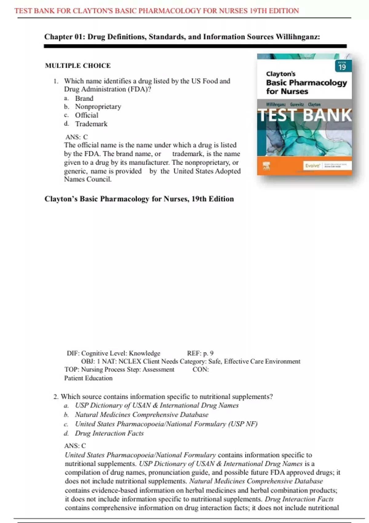 TEST BANK FOR CLAYTON'S BASIC PHARMACOLOGY FOR NURSES 19TH EDITION