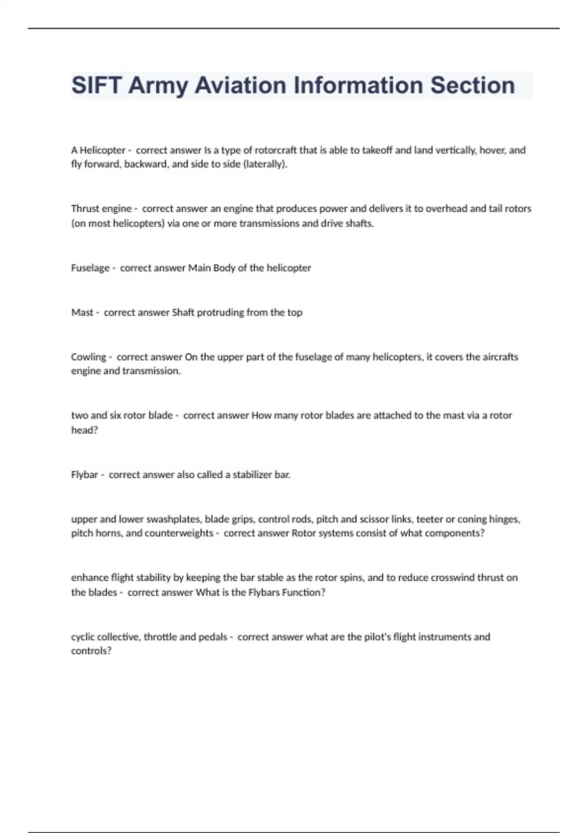 SIFT Army Aviation Information Section Complete Study Guide 2024. A Helicopter - correct answer Is a type of rotorcraft that is able to takeoff and land vertically, hover, and fly forward, backward, and side to side (laterally). Thrust engine - correct answer an engine that produces power and delivers it to overhead and tail rotors (on most helicopters) via one or more transmissions and drive shafts. Fuselage - correct answer Main Body of the helicopter Mast - correct answer Shaft protruding from the top Cowling - correct answer On the upper part of the fuselage of many helicopters, it covers the aircrafts engine and transmission. two and six rotor blade - correct answer How many rotor blades are attached to the mast via a rotor head? Flybar - correct answer also called a stabilizer bar. upper and lower swashplates, blade grips, control rods, pitch and scissor links, teeter or coning hinges, pitch horns, and counterweights - correct answer Rotor systems consist of what components? enhance flight stability by keeping the bar stable as the rotor spins, and to reduce crosswind thrust on the blades - correct answer What is the Flybars Function? cyclic collective, throttle and pedals - correct answer what are the pilot's flight instruments and controls?