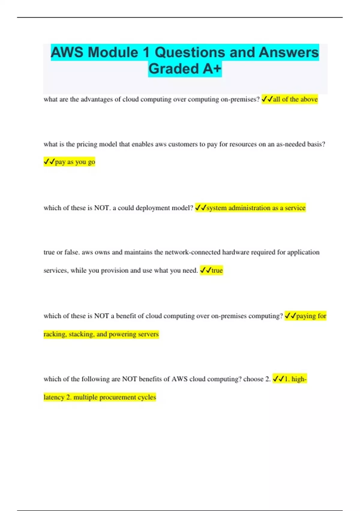 AWS Module 1 Questions and Answers Graded A+ what are the advantages of cloud computing over computing on-premises? all of the above what is the pricing model that enables aws customers to pay for resources on an as-needed basis? pay as you go which of these is NOT. a could deployment model? system administration as a service true or false. aws owns and maintains the network-connected hardware required for application services, while you provision and use what you need. true which of these is NOT a benefit of cloud computing over on-premises computing? paying for racking, stacking, and powering servers
