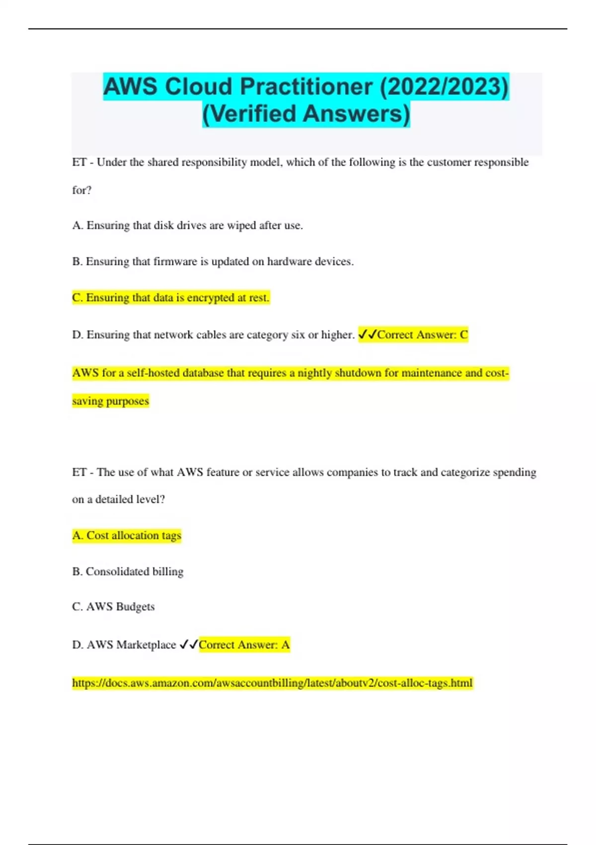AWS Cloud Practitioner (2022/2023) (Verified Answers) ET - Under the shared responsibility model, which of the following is the customer responsible for? A. Ensuring that disk drives are wiped after use. B. Ensuring that firmware is updated on hardware devices. C. Ensuring that data is encrypted at rest. D. Ensuring that network cables are category six or higher. Correct Answer: C AWS for a self-hosted database that requires a nightly shutdown for maintenance and cost- saving purposes ET - The use of what AWS feature or service allows companies to track and categorize spending on a detailed level? A. Cost allocation tags B. Consolidated billing C. AWS Budgets D. AWS Marketplace Correct Answer: A