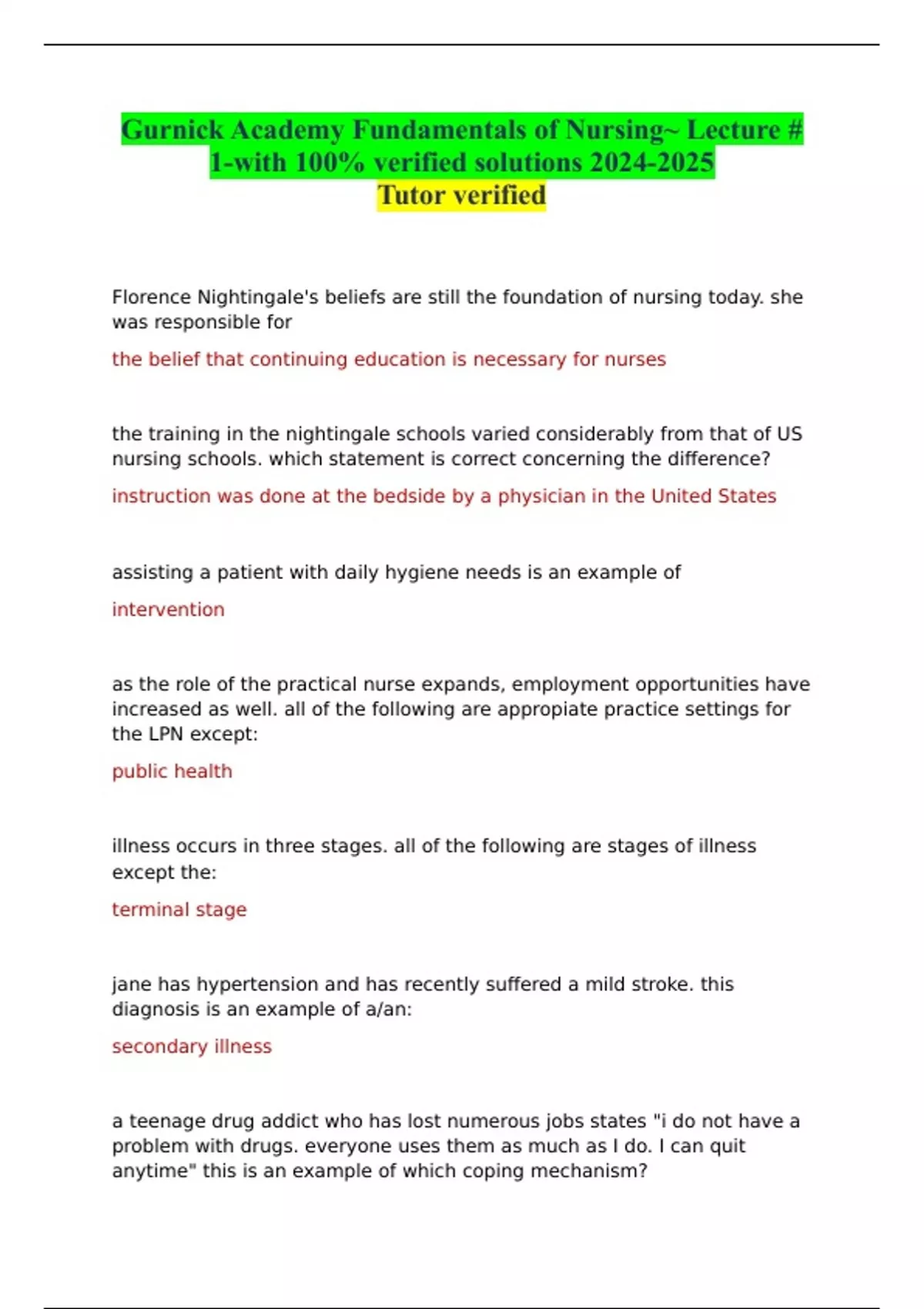 Gurnick Academy Fundamentals of Nursing~ Lecture # 1-with 100% verified solutions