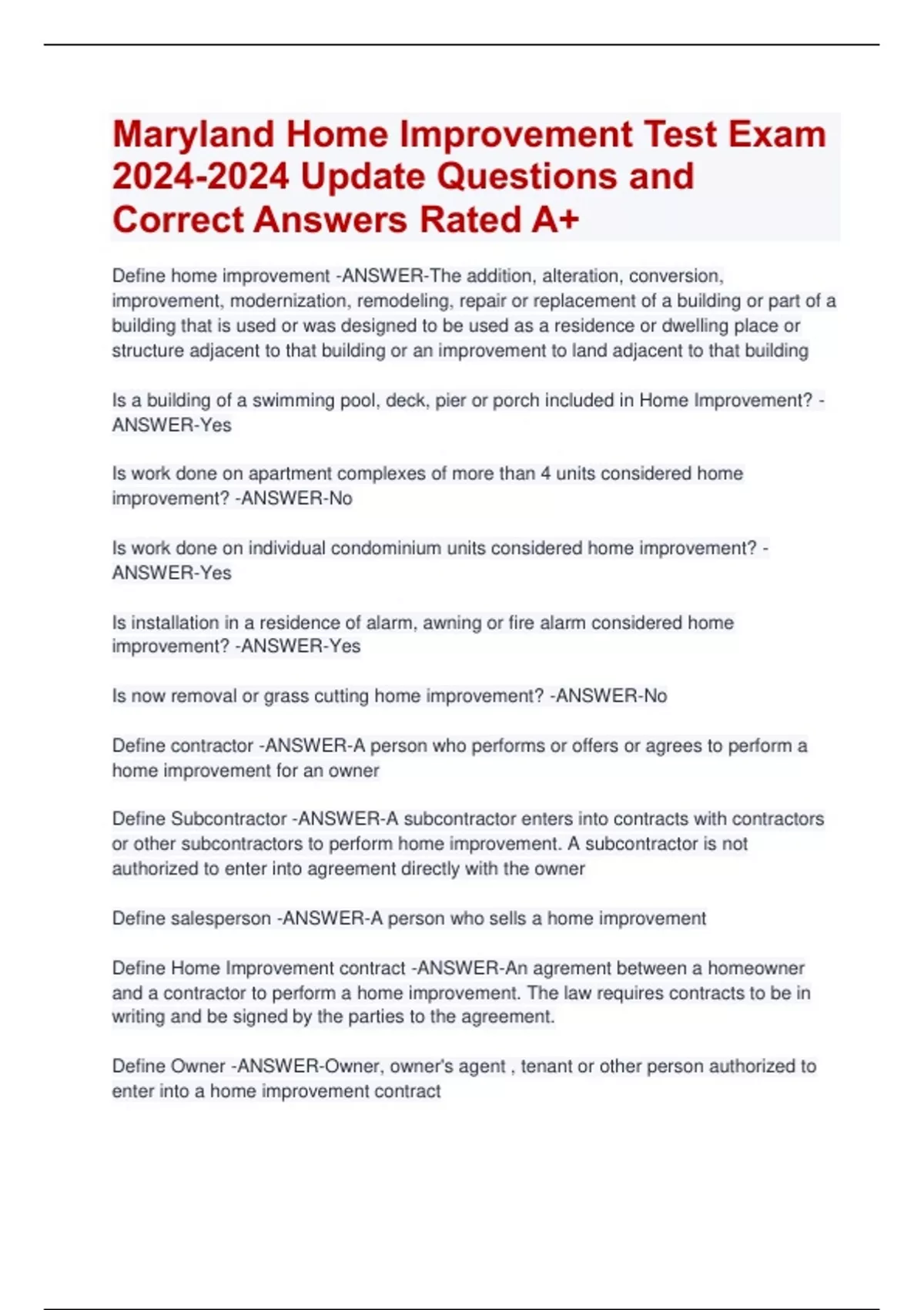 Maryland Home Improvement Test Exam Update Questions and Correct Answers Rated A+