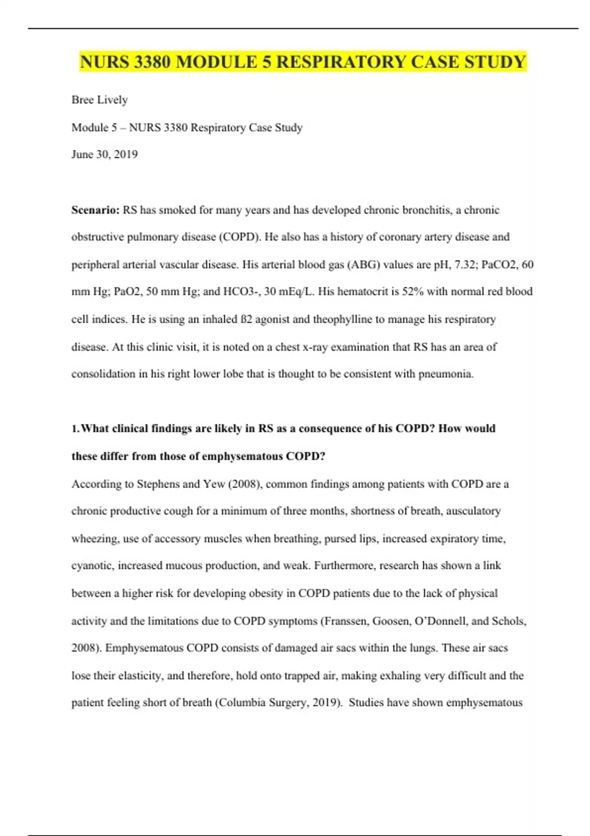 NURS 3380 MODULE 5 RESPIRATORY CASE STUDY