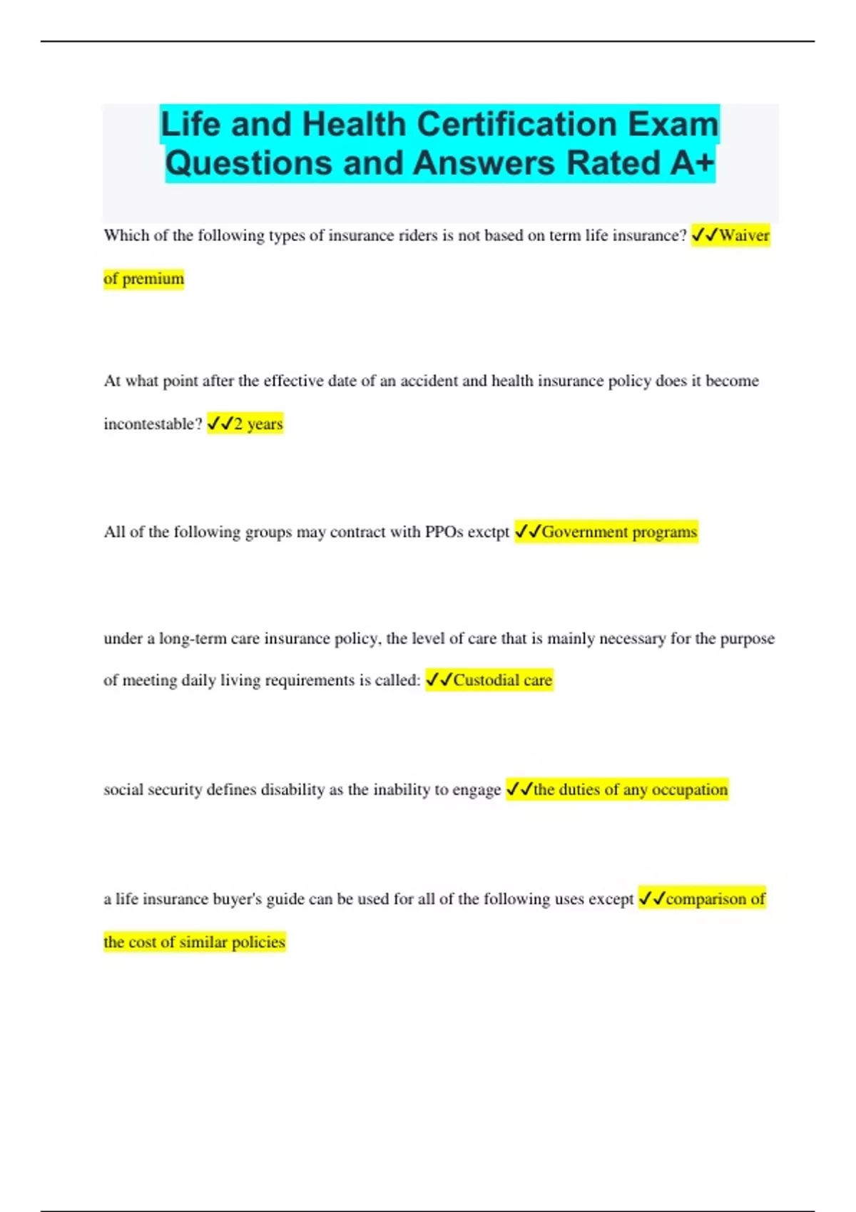 Life and Health Certification Exam Questions and Answers Rated A+ Which of the following types of insurance riders is not based on term life insurance? Waiver of premium At what point after the effective date of an accident and health insurance policy does it become incontestable? 2 years All of the following groups may contract with PPOs exctpt Government programs under a long-term care insurance policy, the level of care that is mainly necessary for the purpose of meeting daily living requirements is called: Custodial care social security defines disability as the inability to engage the duties of any occupation a life insurance buyer's guide can be used for all of the following uses except comparison of the cost of similar policies all of the following are considered service providers except a commercial insurance company an agent attends a continuing education course offering 12 hours of credit before the course is approved by the commissioner. in this case, the agent will receive no credit for the course, because courses must be approved before study begins PPO preferred provider organization ( HMO health maintenance organization (cheaper - less options) All of the following are duties of the commissioner EXCEPT writing the Washington insurance laws Who investigates claims on behalf of the insurer or the insured? An Adjuster Which of the following sales of insurance is subject to replacement regulations? Sale of new individual life insurance policy that causes an existing life insurance policy to be surrendered. a lapsed life insurance policy may be reinstated Within 30 days after the grace period expires policies classified as non-occupational normally provide coverage for losses due to sickness or accidents that are not work-related. a guaranteed insurability rider normally provides that between ages 25 and 40, additional life insurance may be purchased without proof of insurability whenever the policyowner wishes when a health maintenance organization chooses a limited number of health care providers to provide services to its subscribers, this is known as A Gatekeeper system Which of the following correctly describes Medicaid? It provides medical benefits for certain low-income people all of the following are required provisions in health care insurance policies EXCEPT Change of occupation An insurer that is incorporated and operates in the same state with which it is organized is called Domestic Money taken out of a modified endowment contract (MEC). Subject to unfavorable tax rules Exclusive or Captive Agents represent the insurance company When an insured has a major medical plan with first dollar coverage, this means no deductible applies Restoration of a lapsed policy as it was originally purchased is known as Reinstatement All of the following would likely be eligible for group health insurance EXCEPT all the uninsured residents of a nursing home in noncontributory group health plans, how many eligible employees must be covered by the plan? 100% Sherwood has no valid will but has named his estate as the beneficiary of his life insurance policy. As a result, he can expect that the policy proceeds