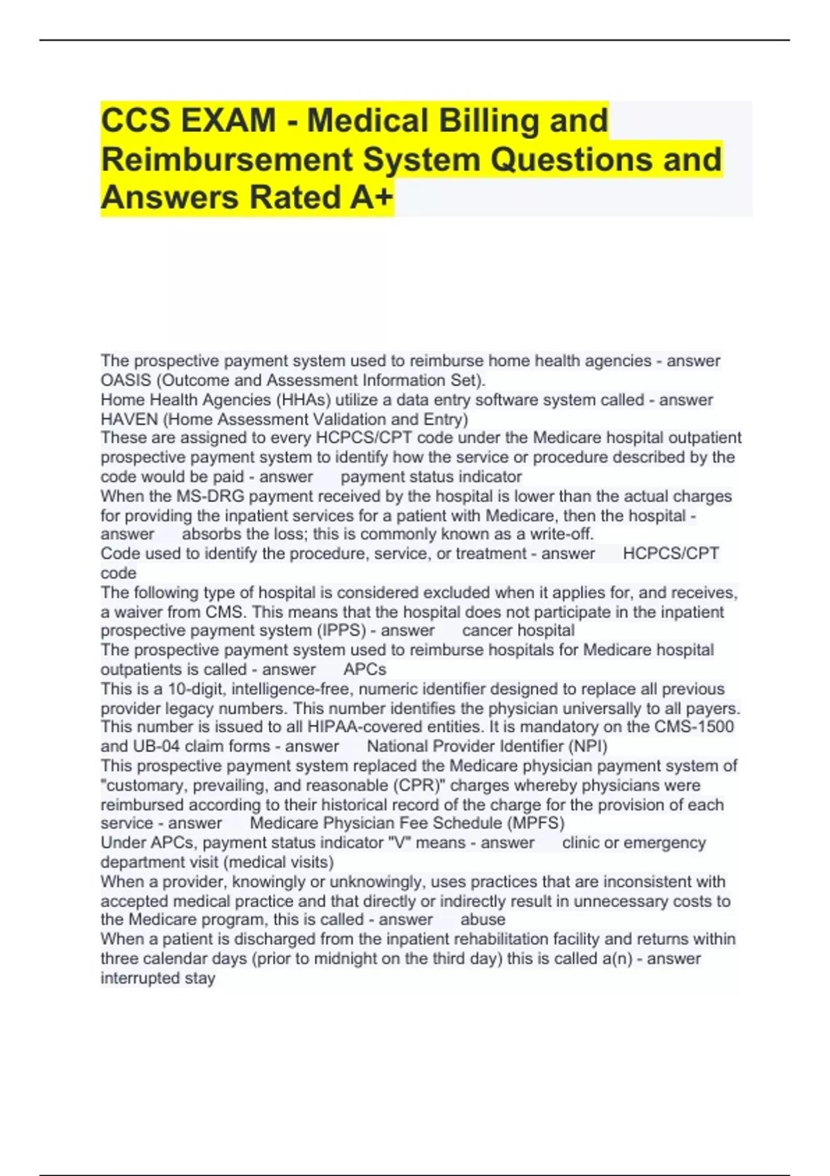 CCS EXAM - Medical Billing and Reimbursement System Questions and Answers Rated A+