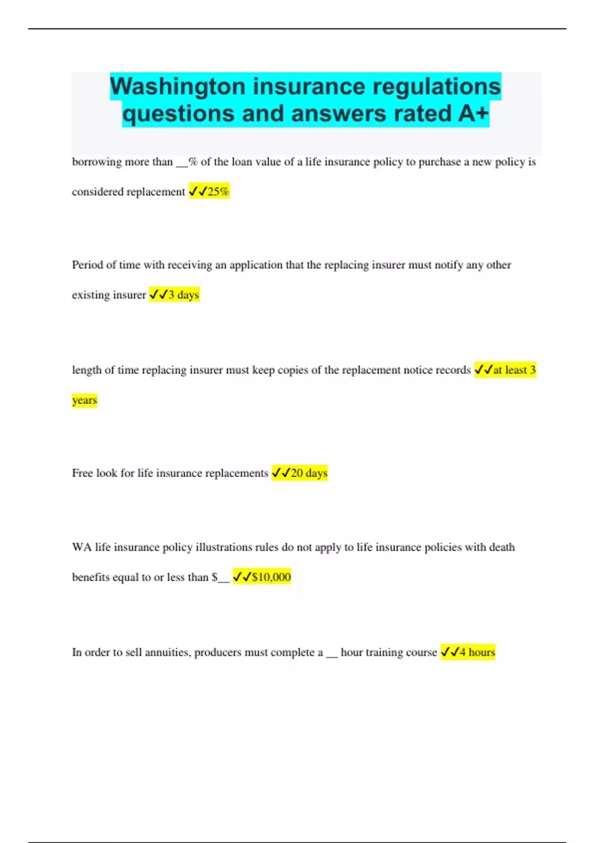 Washington insurance regulations questions and answers rated A+