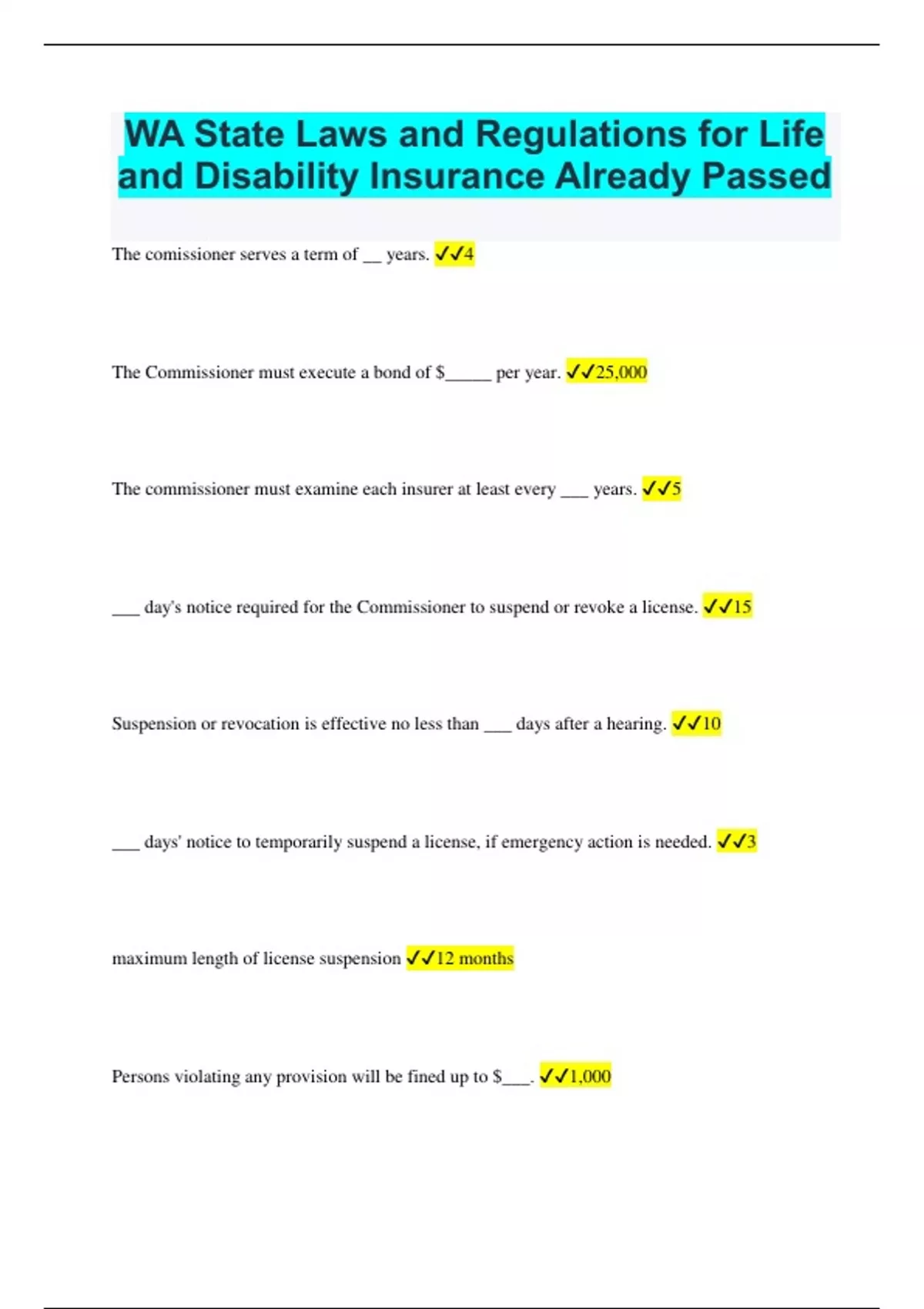 WA State Laws and Regulations for Life and Disability Insurance Already Passed The comissioner serves a term of __ years. 4 The Commissioner must execute a bond of $_____ per year. 25,000 The commissioner must examine each insurer at least every ___ years. 5 ___ day's notice required for the Commissioner to suspend or revoke a license. 15 Suspension or revocation is effective no less than ___ days after a hearing. 10 ___ days' notice to temporarily suspend a license, if emergency action is needed. 3 maximum length of license suspension 12 months Persons violating any provision will be fined up to $___. 1,000 Civil penalty for persons knowingly engaging in insurance activities without a license is $_____. 25,000 ___ days is needed from licensees time to notify the Commissioner of address change. 30 A surplus lines affidavit must be filed with the Commissioner within ___ days after the insurance transaction. 60 Washington Life and Disability Guaranty Association (protects insureds from impaired or insolvent insurers) limit is $___. 500,000 Applicant needs to be at least ___ years old. 18 A temporary insurance producer license may be issued for up to ___ days. 180 A nonresident producer must file a change of address within ___ days. 30 Appointment: Days from the agency contract date, or the date that the first insurance application is submitted than an insurer must file a notice of appointment is ____ days. 15 Appointment: When terminating a producer appointment for cause, an insurer must inform the Commissioner within ___ days of the termination. 30 Unless suspended or revoked, licenses renew every ___ years. 2 License renewal fee is $___. 55 Continuing Education: CE requirement for each 2 year licensing term is ___ credit hours. Number of hours required for ethics CE is ___.