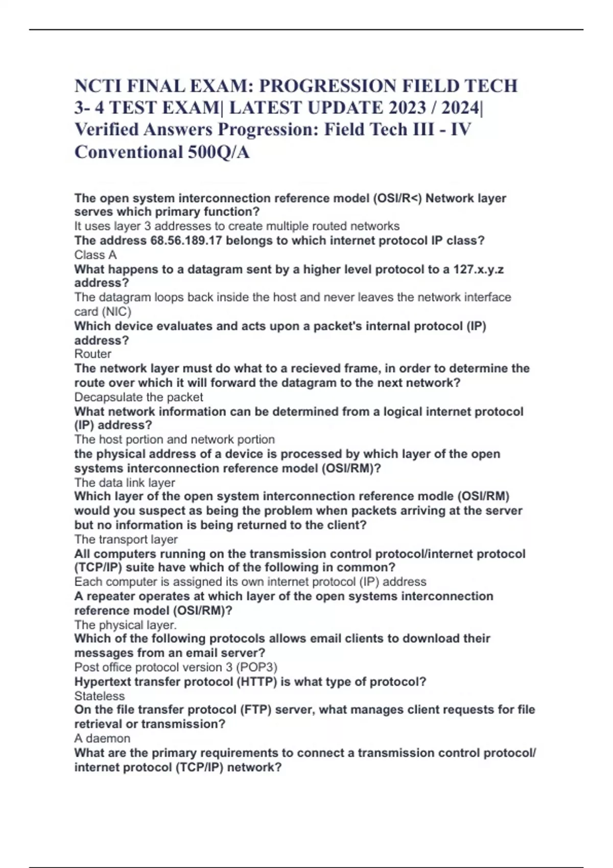 NCTI FINAL EXAM: PROGRESSION FIELD TECH 3- 4 TEST EXAM| LATEST UPDATE 2023 / 2024| Verified Answers Progression: Field Tech III - IV Conventional 500Q/A The open system interconnection reference model (OSI/R<) Network layer serves which primary function? It uses layer 3 addresses to create multiple routed networks The address 68.56.189.17 belongs to which internet protocol IP class? Class A What happens to a datagram sent by a higher level protocol to a 127.x.y.z address? The datagram loops back inside the host and never leaves the network interface card (NIC) Which device evaluates and acts upon a packet's internal protocol (IP) address? Router The network layer must do what to a recieved frame, in order to determine the route over which it will forward the datagram to the next network? Decapsulate the packet What network information can be determined from a logical internet protocol (IP) address? The host portion and network portion the physical address of a device is processed by which layer of the open systems interconnection reference model (OSI/RM)? The data link layer Which layer of the open system interconnection reference modle (OSI/RM) would you suspect as being the problem when packets arriving at the server but no information is being returned to the client? The transport layer All computers running on the transmission control protocol/internet protocol (TCP/IP) suite have which of the following in common? Each computer is assigned its own internet protocol (IP) address A repeater operates at which layer of the open systems interconnection reference model (OSI/RM)? The physical layer. Which of the following protocols allows email clients to download their messages from an email server? Post office protocol version 3 (POP3) Hypertext transfer protocol (HTTP) is what type of protocol? Stateless On the file transfer protocol (FTP) server, what manages client requests for file retrieval or transmission? A daemon What are the primary requirements to connect a transmission control protocol/ internet protocol (TCP/IP) network?