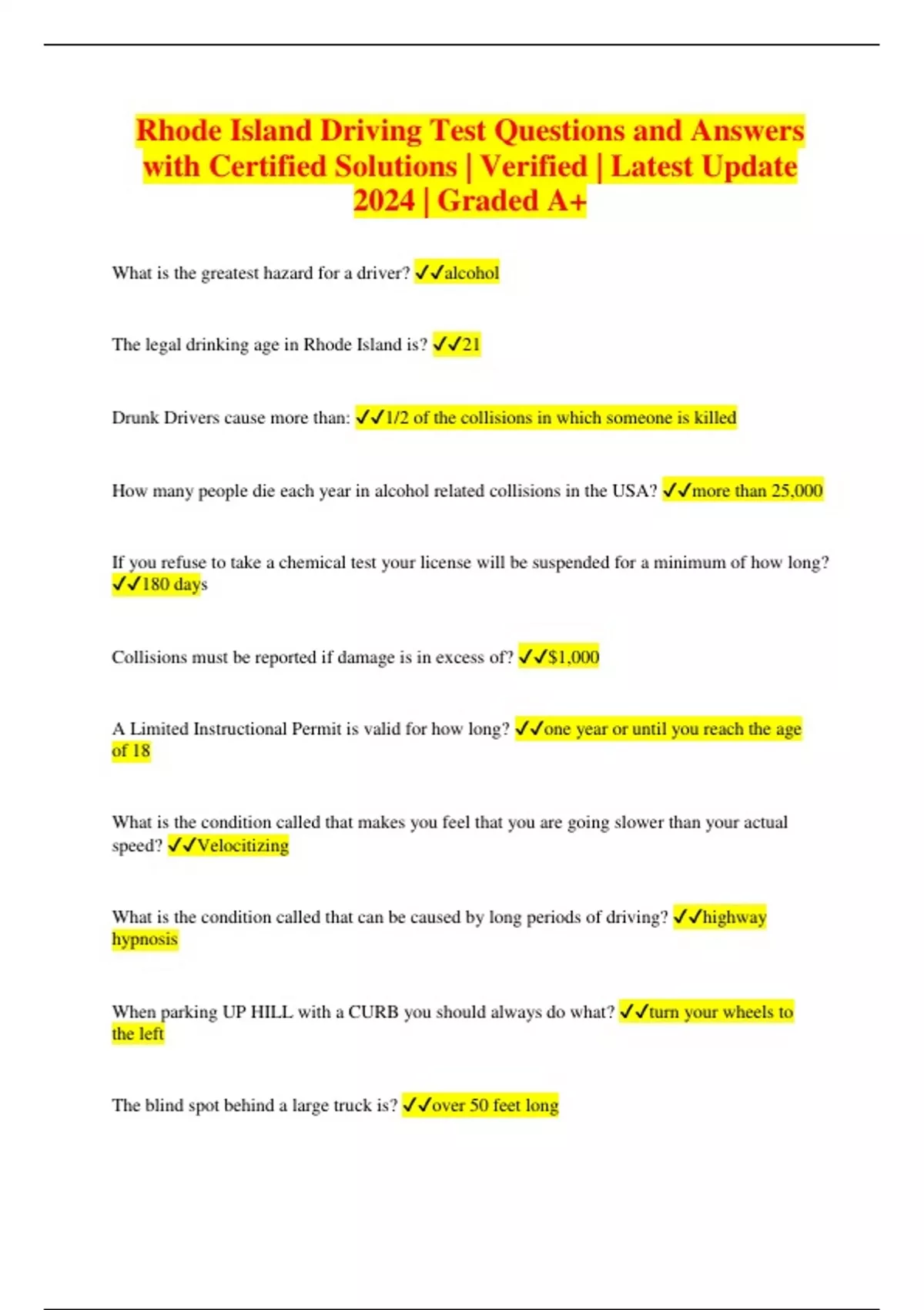 Rhode Island Driving Test Questions and Answers with Certified Solutions | Verified | Latest Update 2024 | Graded A+ What is the greatest hazard for a driver? alcohol The legal drinking age in Rhode Island is? 21 Drunk Drivers cause more than: 1/2 of the collisions in which someone is killed How many people die each year in alcohol related collisions in the USA? more than 25,000 If you refuse to take a chemical test your license will be suspended for a minimum of how long? 180 days Collisions must be reported if damage is in excess of? $1,000 A Limited Instructional Permit is valid for how long? one year or until you reach the age of 18 What is the condition called that makes you feel that you are going slower than your actual speed? Velocitizing What is the condition called that can be caused by long periods of driving? highway hypnosis When parking UP HILL with a CURB you should always do what? turn your wheels to the left The