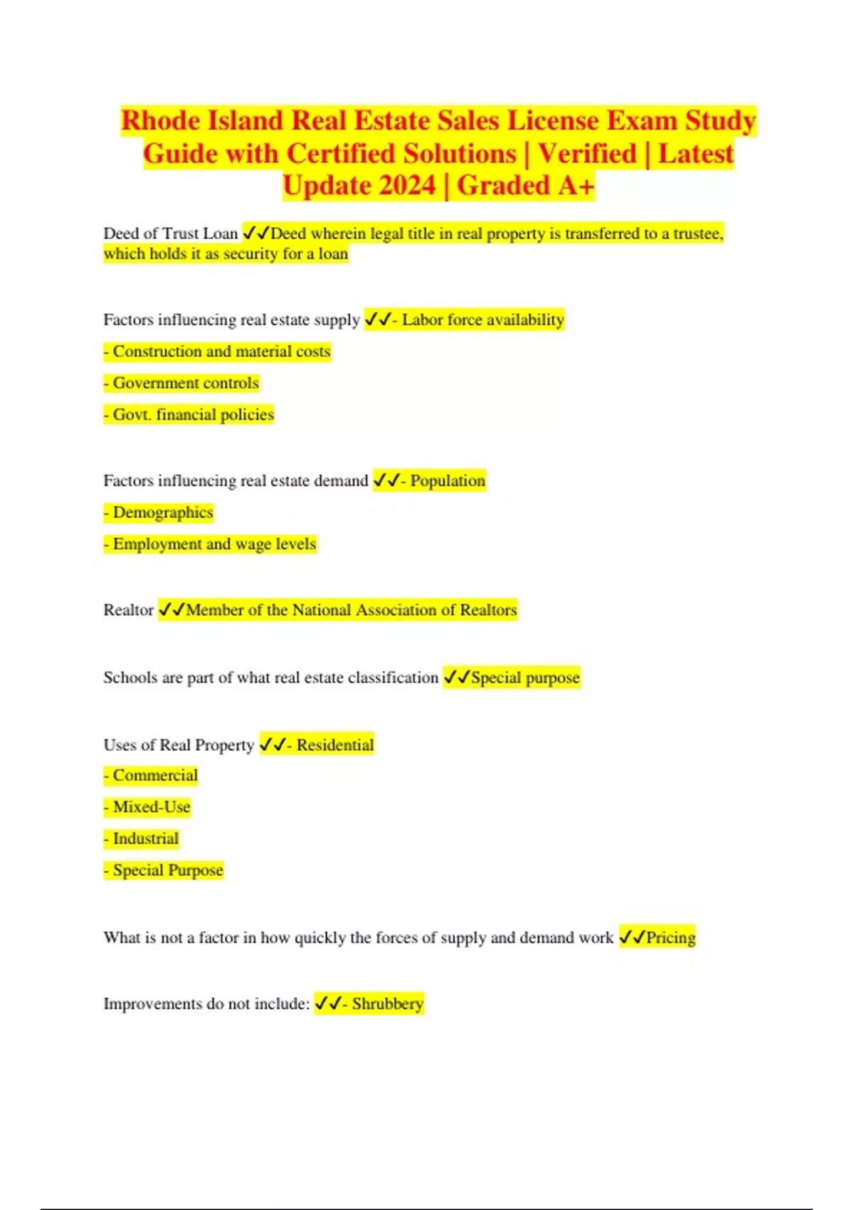 Rhode Island Real Estate Sales License Exam Study Guide with Certified Solutions | Verified | Latest Update 2024 | Graded A+ Deed of Trust Loan Deed wherein legal title in real property is transferred to a trustee, which holds it as security for a loan Factors influencing real estate supply - Labor force availability - Construction and material costs - Government controls - Govt. financial policies Factors influencing real estate demand - Population - Demographics - Employment and wage levels Realtor Member of the National Association of Realtors Schools are part of what real estate classification Special purpose Uses of Real Property - Residential - Commercial - Mixed-Use - Industrial - Special Purpose What is not a factor in how quickly the forces of supply and demand work Pricing Improvements do not include: - Shrubbery - Trees - Lawns Real property includes: - Interests - Benefits - Rights that are automatically included in the ownership of land and real estate Bundle of Legal Rights, as part of Real Property, include: Right of: - Possession - Control - Enjoyment - Exclusion - Disposition Title