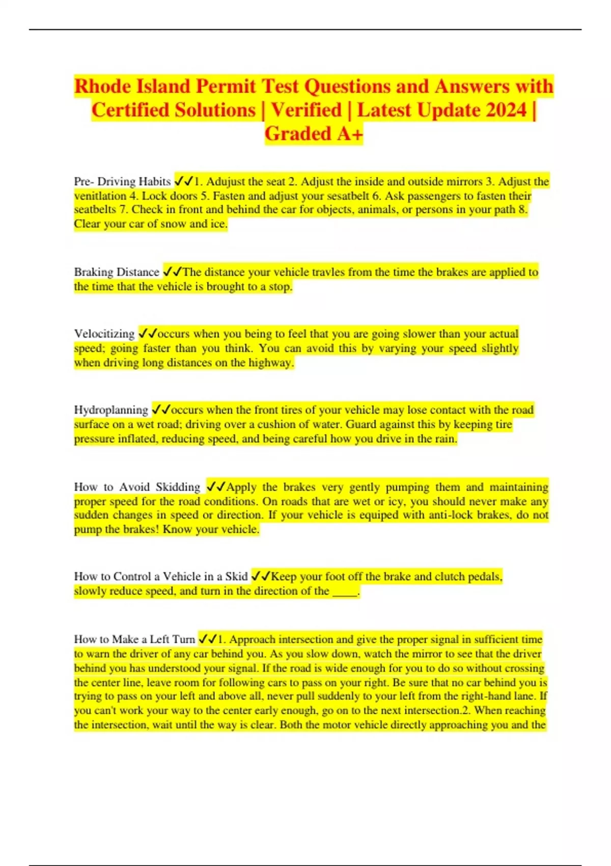 Rhode Island Permit Test Questions and Answers with Certified Solutions | Verified | Latest Update 2024 | Graded A+