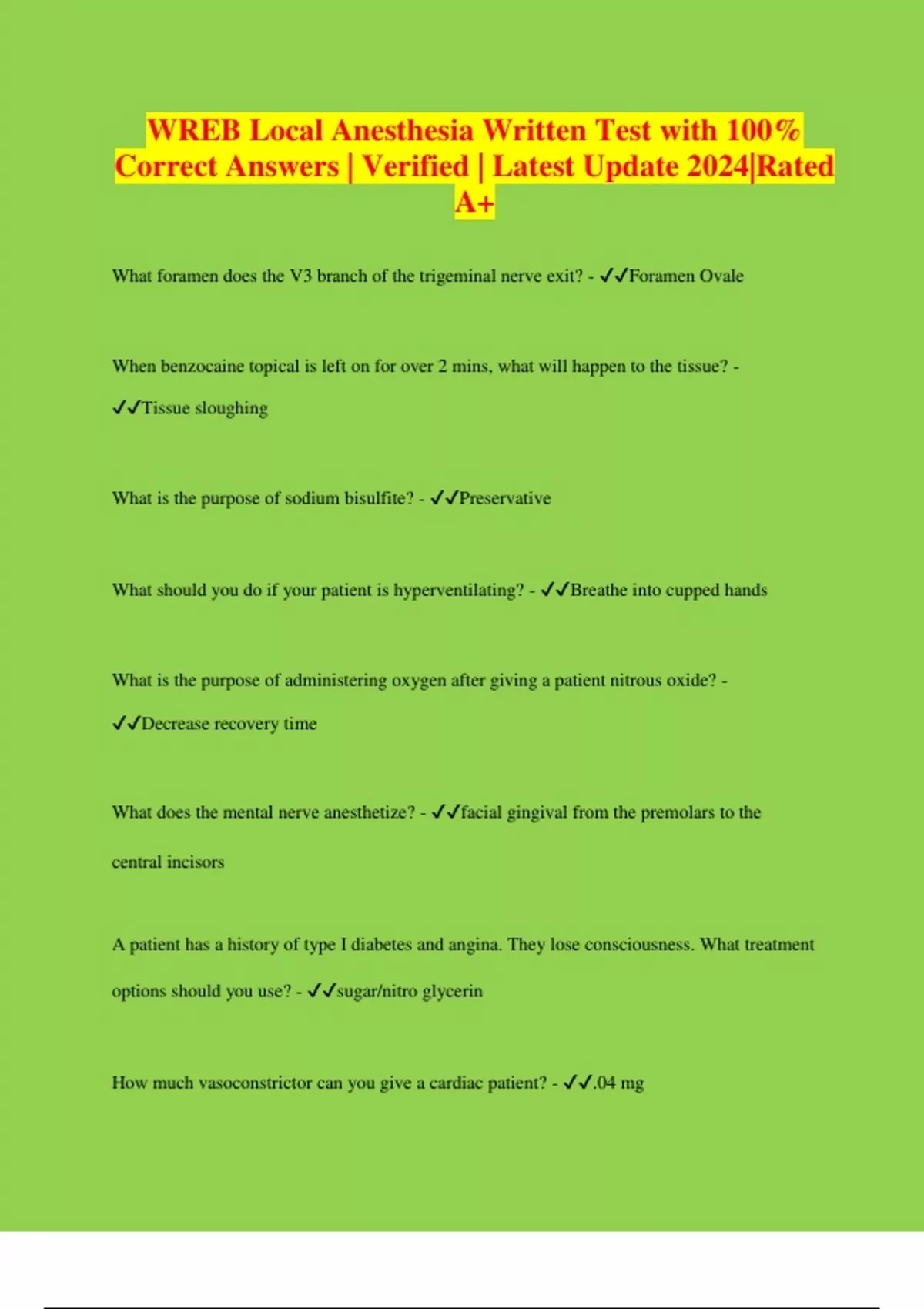 WREB Local Anesthesia Written Test with 100% Correct Answers | Verified | Latest Update 2024|Rated A+