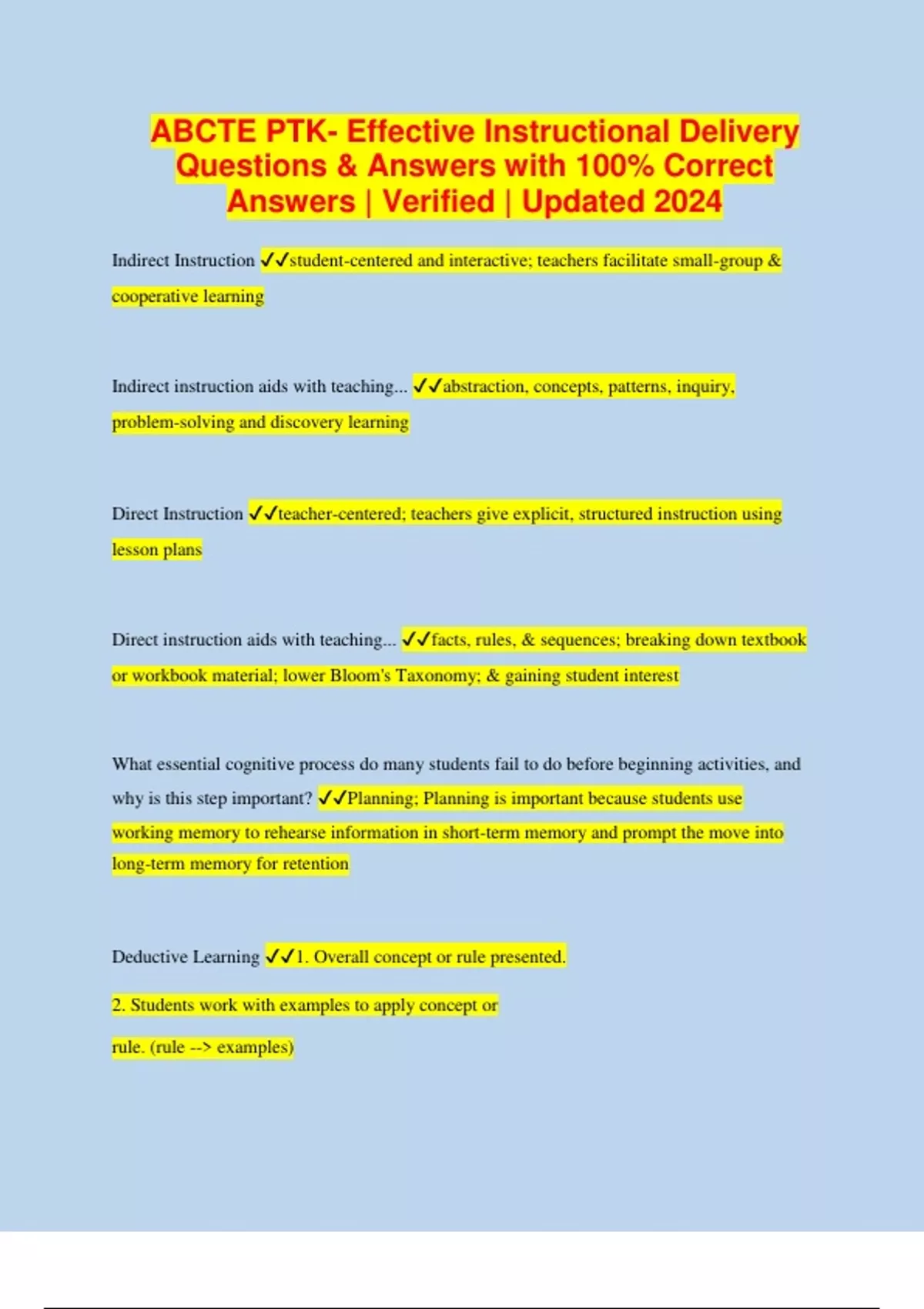 ABCTE PTK- Effective Instructional Delivery Questions & Answers with 100% Correct Answers | Verified | Updated 2024