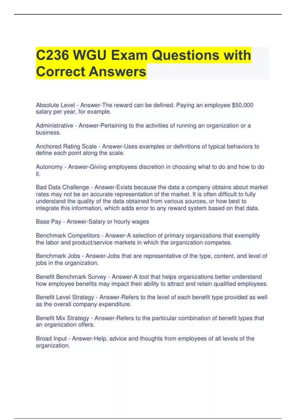 Absolute Level - Answer-The reward can be defined. Paying an employee $50,000 salary per year, for example. Administrative - Answer-Pertaining to the activities of running an organization or a business. Anchored Rating Scale - Answer-Uses examples or definitions of typical behaviors to define each point along the scale. Autonomy - Answer-Giving employees discretion in choosing what to do and how to do it. Bad Data Challenge - Answer-Exists because the data a company obtains about market rates may not be an accurate representation of the market. It is often difficult to fully understand the quality of the data obtained from various sources, or how best to integrate this information, which adds error to any reward system based on that data. Base Pay - Answer-Salary or hourly wages Benchmark Competitors - Answer-A selection of primary organizations that exemplify the labor and product/service markets in which the organization competes. Benchmark Jobs - Answer-Jobs that are representative of the type, content, and level of jobs in the organization. Benefit Benchmark Survey - Answer-A tool that helps organizations better understand how employee benefits may impact their ability to attract and retain qualified employees. Benefit Level Strategy - Answer-Refers to the level of each benefit type provided as well as the overall company expenditure. Benefit Mix Strategy - Answer-Refers to the particular combination of benefit types that an organization offers. Broad Input - Answer-Help, advice and thoughts from employees of all levels of the organization