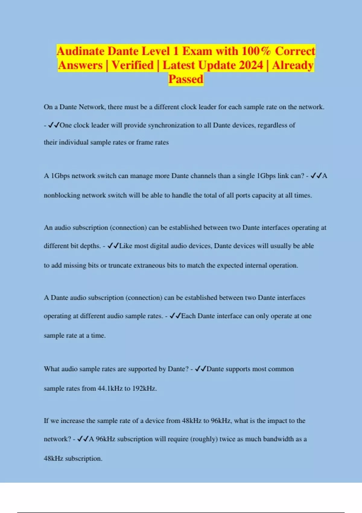 Audinate Dante Level 1 Exam with 100% Correct Answers | Verified | Latest Update 2024 | Already Passed