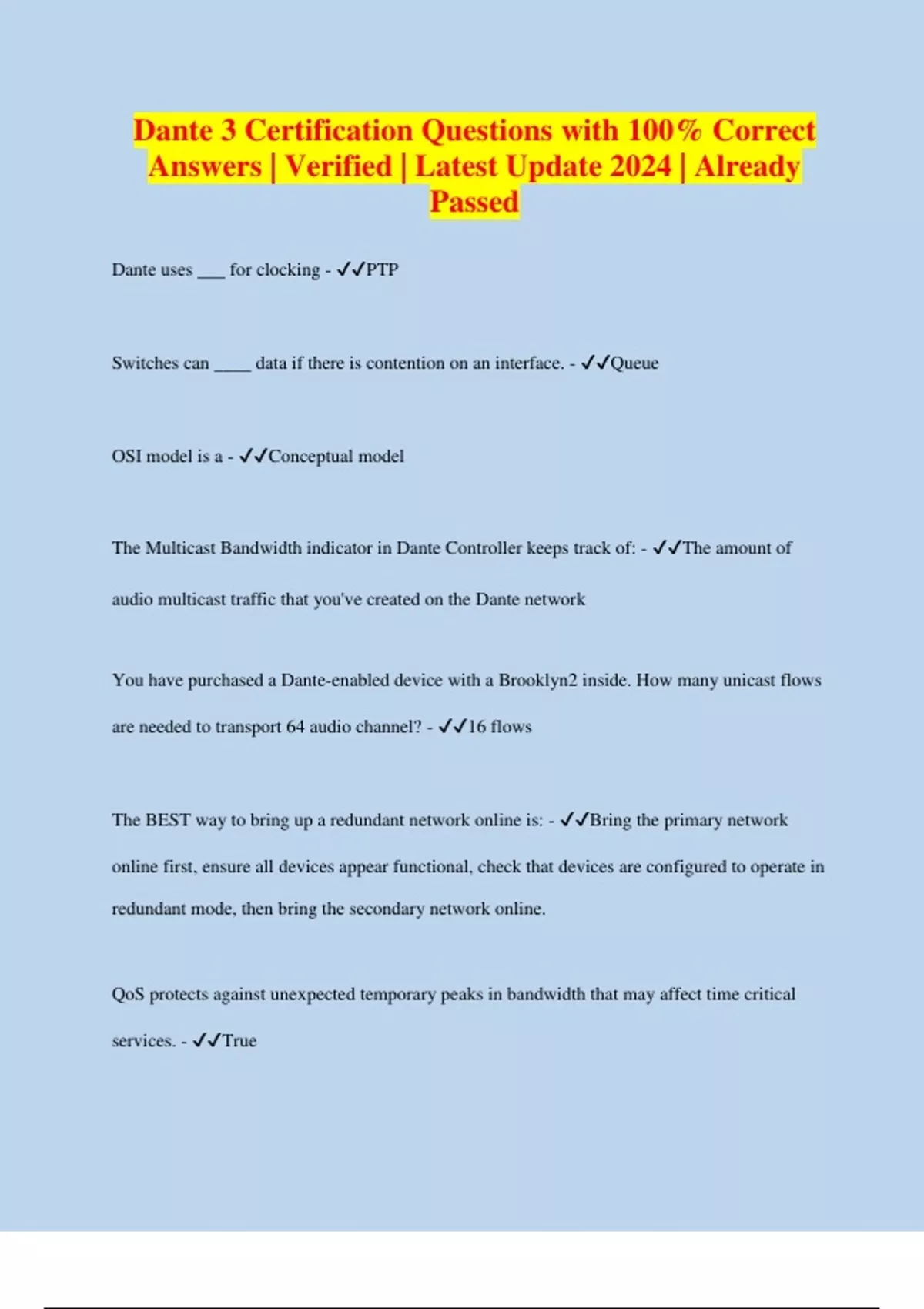 Dante 3 Certification Questions with 100% Correct Answers | Verified | Latest Update 2024 | Already Passed