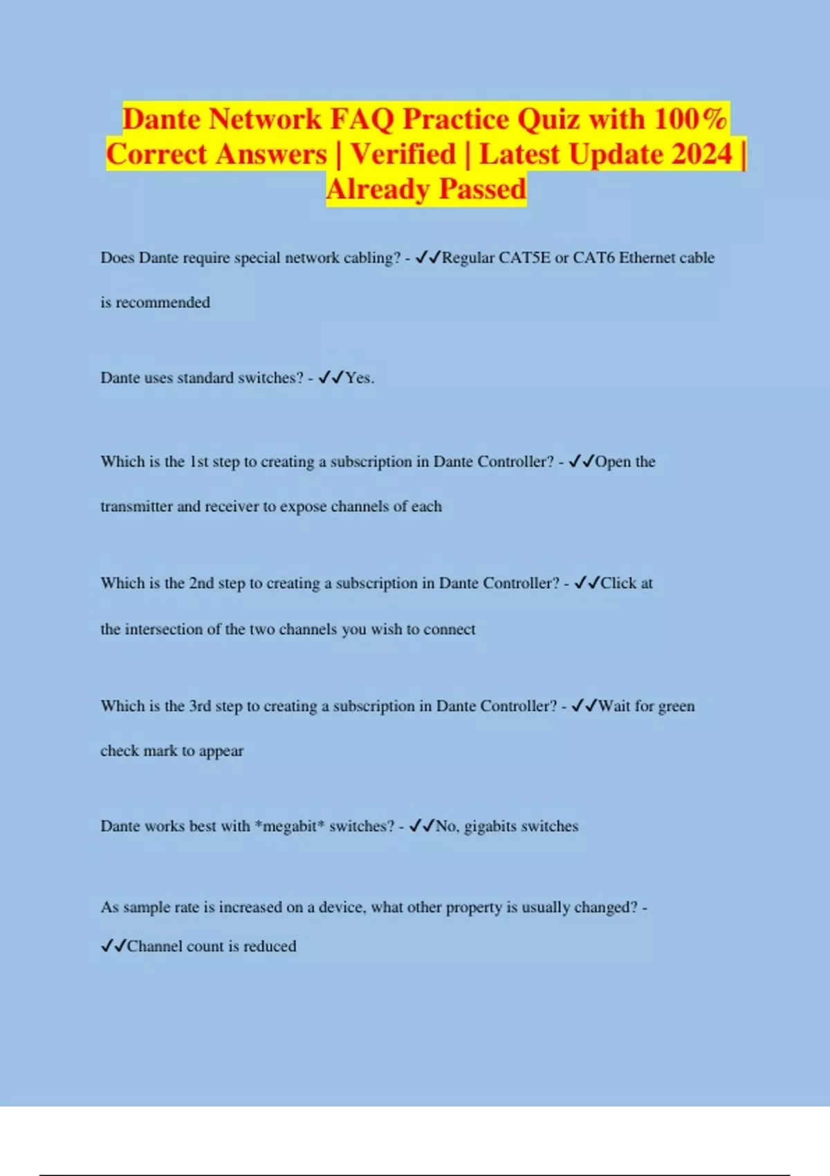 Dante Network FAQ Practice Quiz with 100% Correct Answers | Verified | Latest Update 2024 | Already Passed